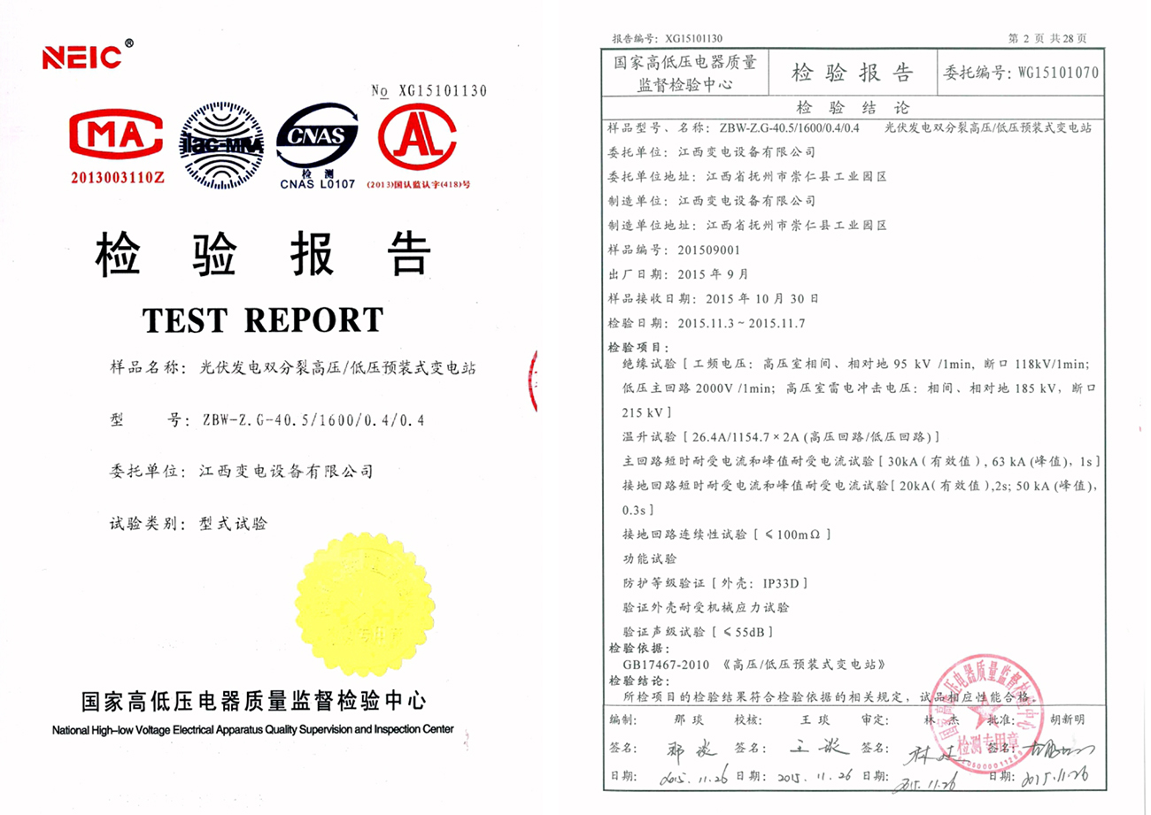 檢驗(yàn)報(bào)告:ZBW-Z.G-40.5/1600/0.4/0.4 光伏發(fā)電雙分裂高壓/低壓預(yù)裝式變電站(點(diǎn)擊下載)