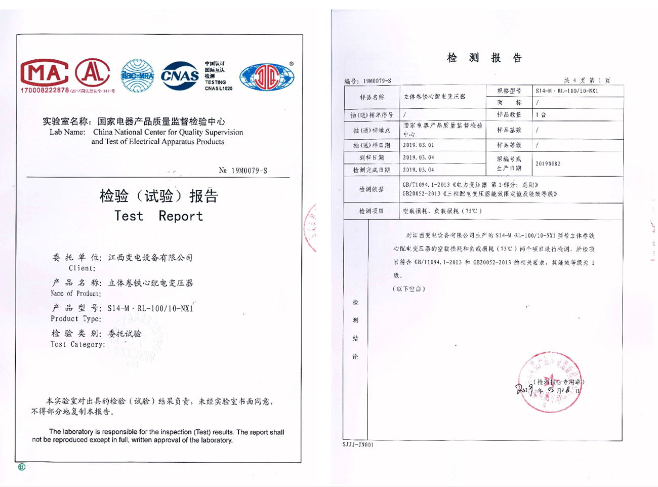 檢驗(yàn)(試驗(yàn))報(bào)告:S14-M·RL-100/10-NX1 立體卷鐵心配電變壓器(點(diǎn)擊下載)