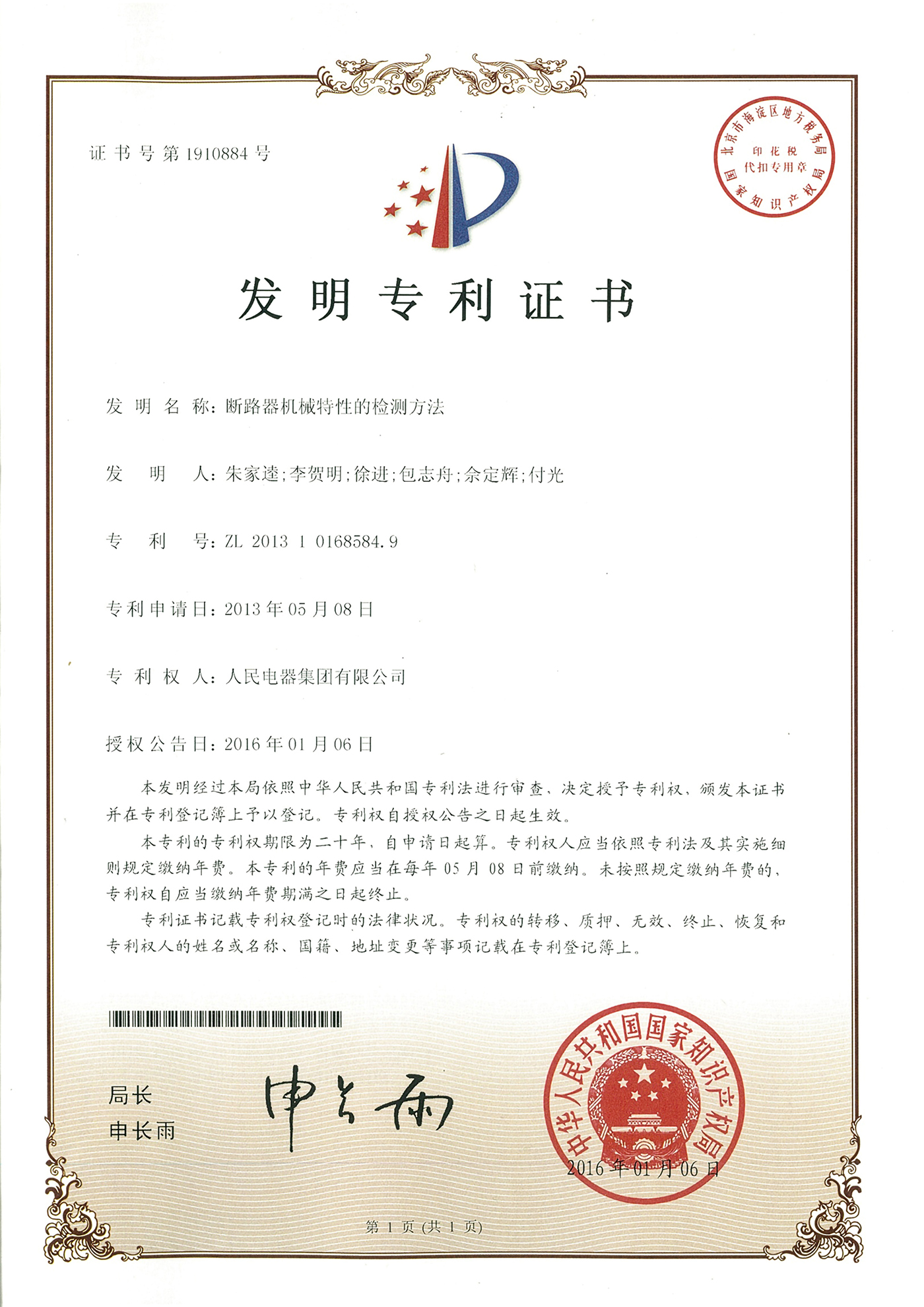 發(fā)明專利證書:斷路器機械特性的檢測方法(點擊下載)