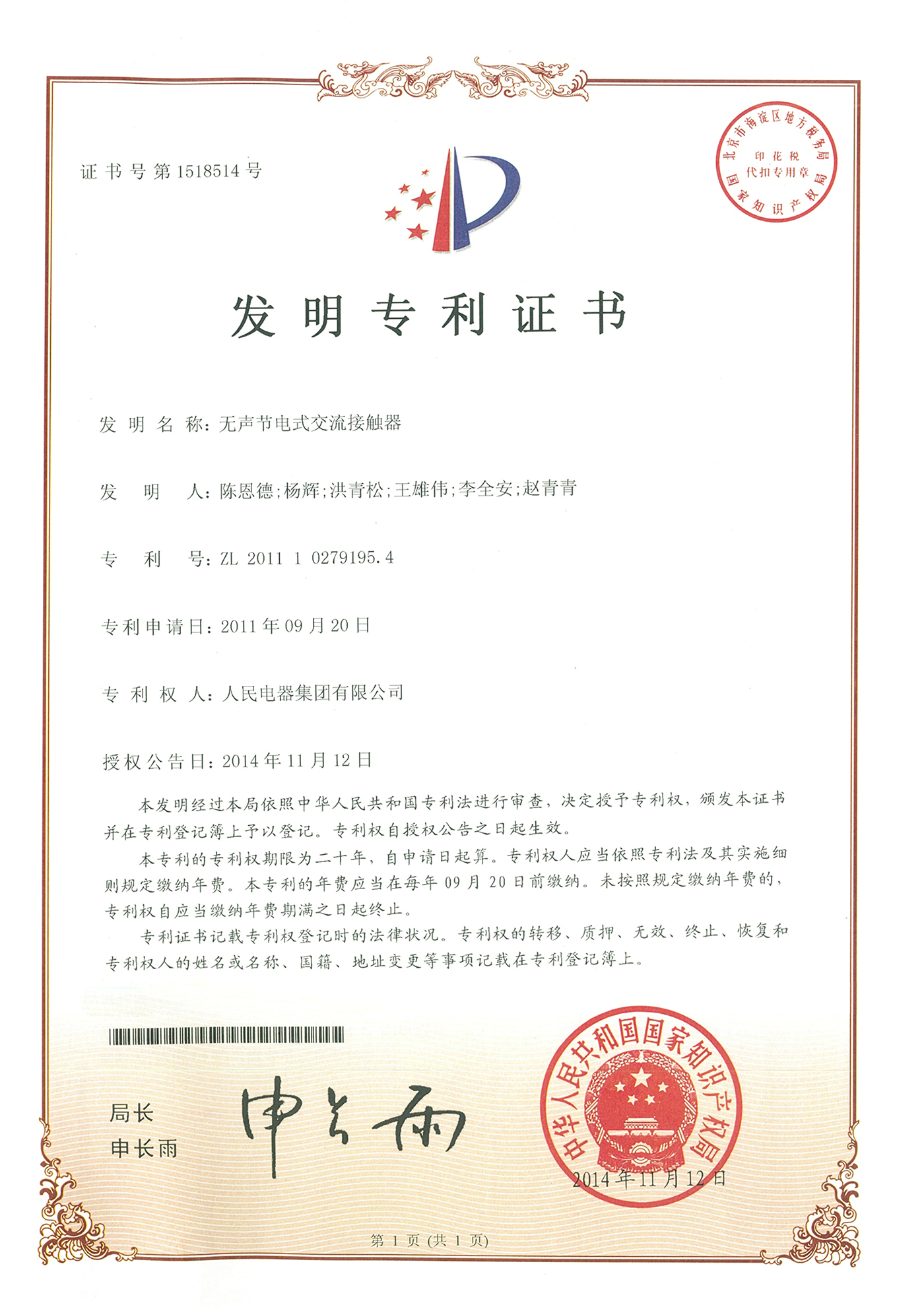 發(fā)明專利證書:無聲節(jié)電式交流接觸器(點(diǎn)擊下載)