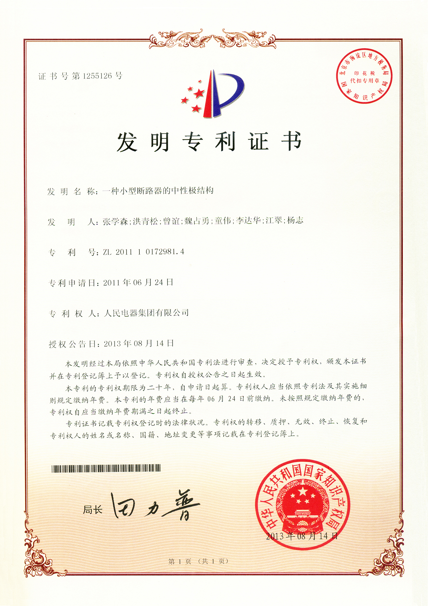 發(fā)明專利證書:一種小型斷路器的中性極結(jié)構(gòu)(點(diǎn)擊下載)