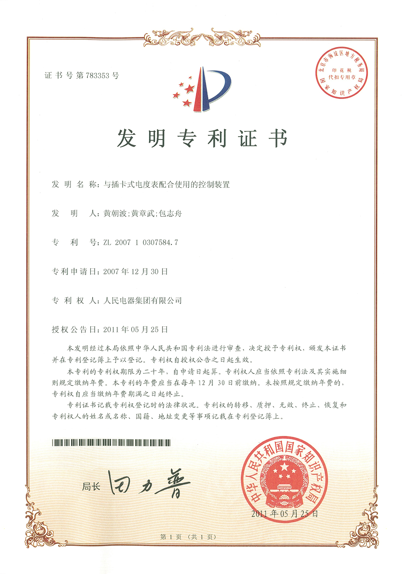 發(fā)明專利證書:與插卡式電度表配合使用的控制裝置(點(diǎn)擊下載)
