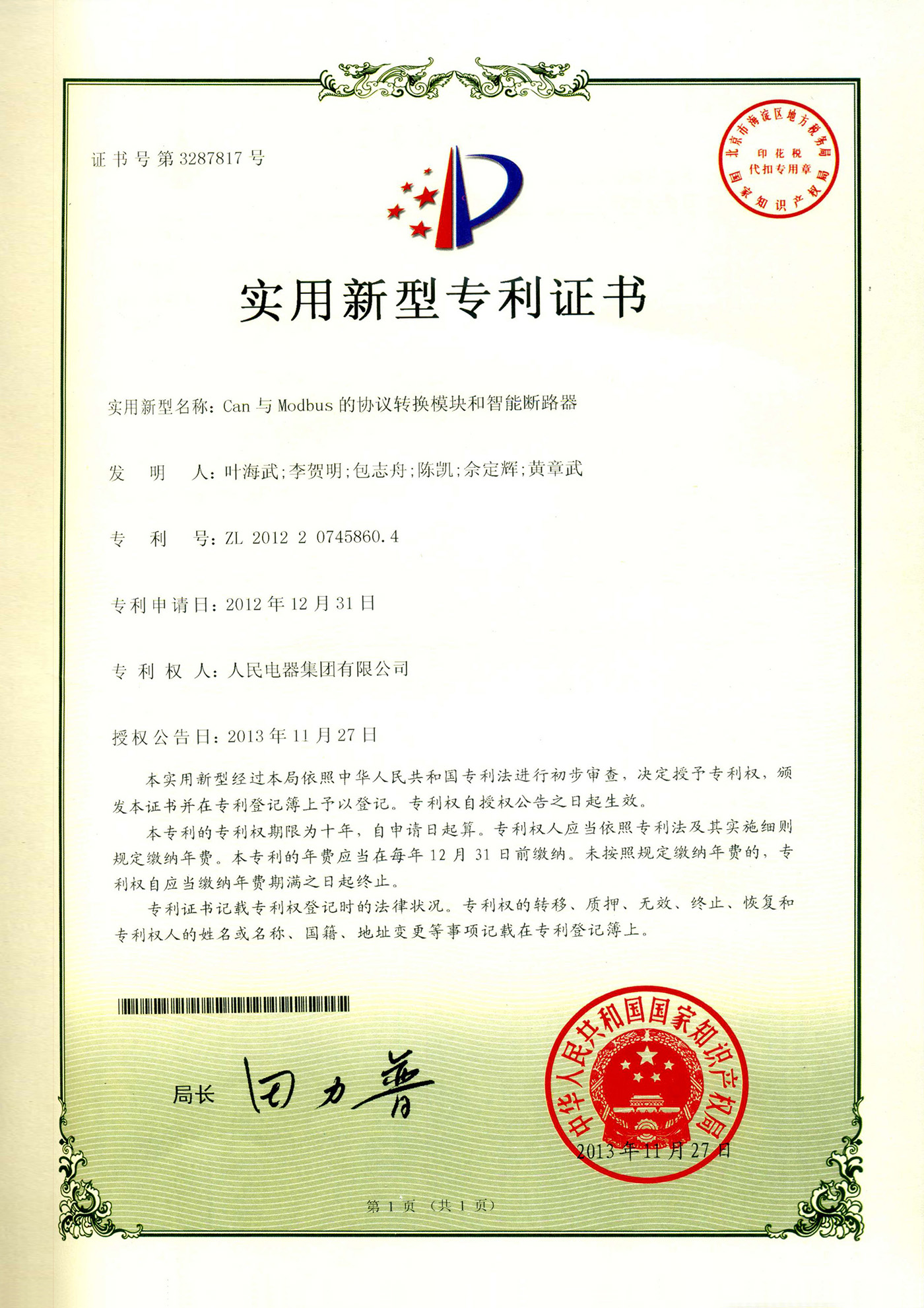 實(shí)用新型專利證書:Can與Modbus的協(xié)議轉(zhuǎn)換模塊和智能斷路器(點(diǎn)擊下載)