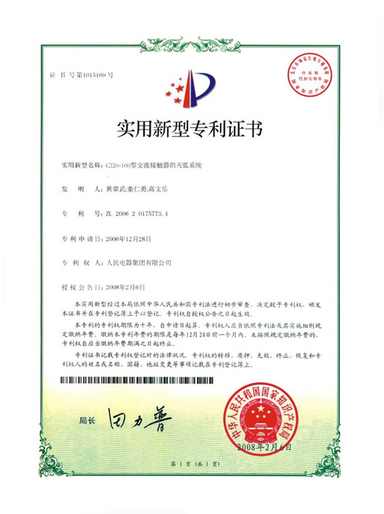實(shí)用新型專利證書:CJ20-100型交流接觸器的滅弧裝置(點(diǎn)擊下載)