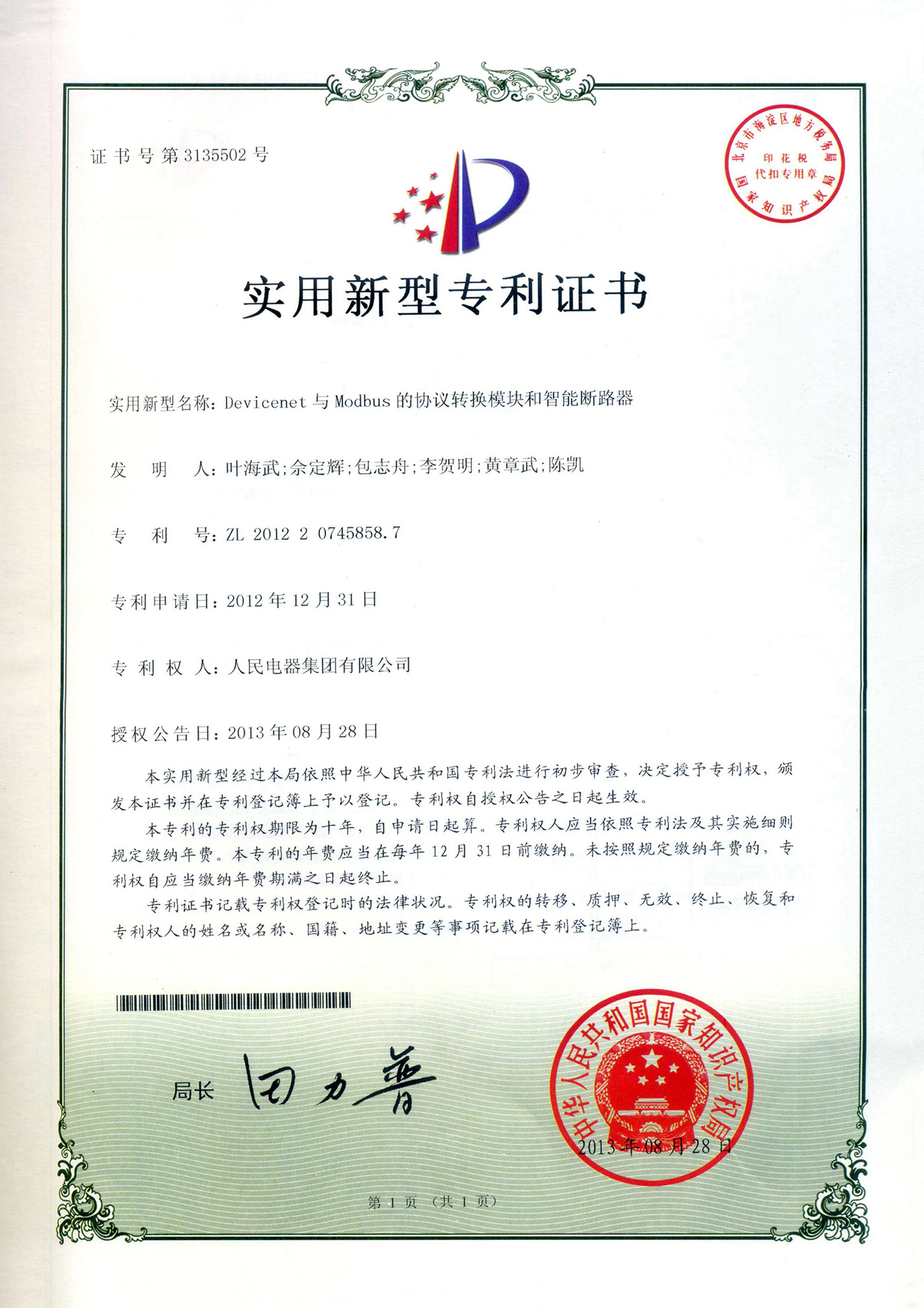實用新型專利證書:Devicenet與Modbus的協(xié)議轉(zhuǎn)換模塊和智能斷路器(點擊下載)