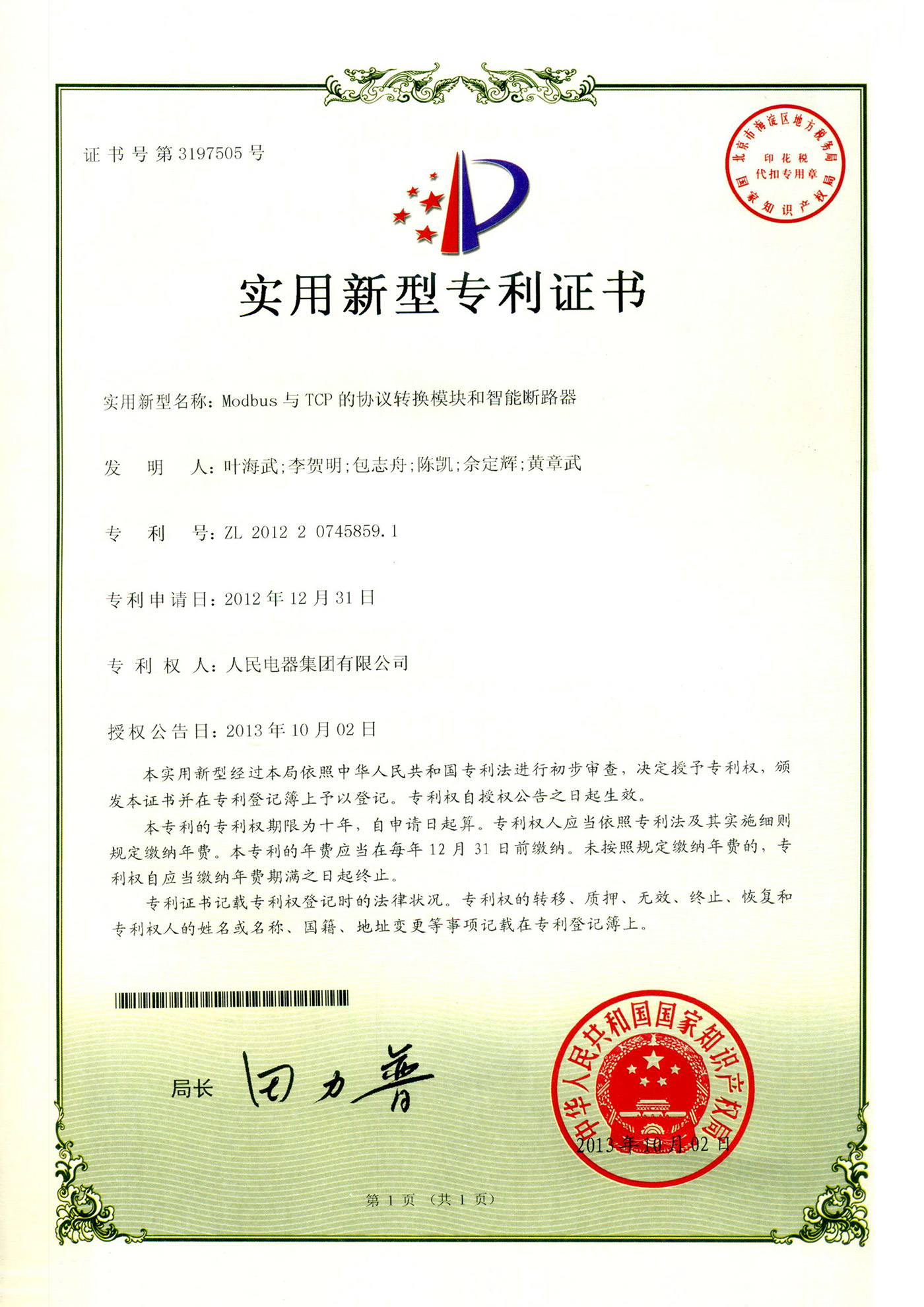 實(shí)用新型專利證書(shū):Modbus與TCP的協(xié)議轉(zhuǎn)換模塊和智能斷路器(點(diǎn)擊下載)