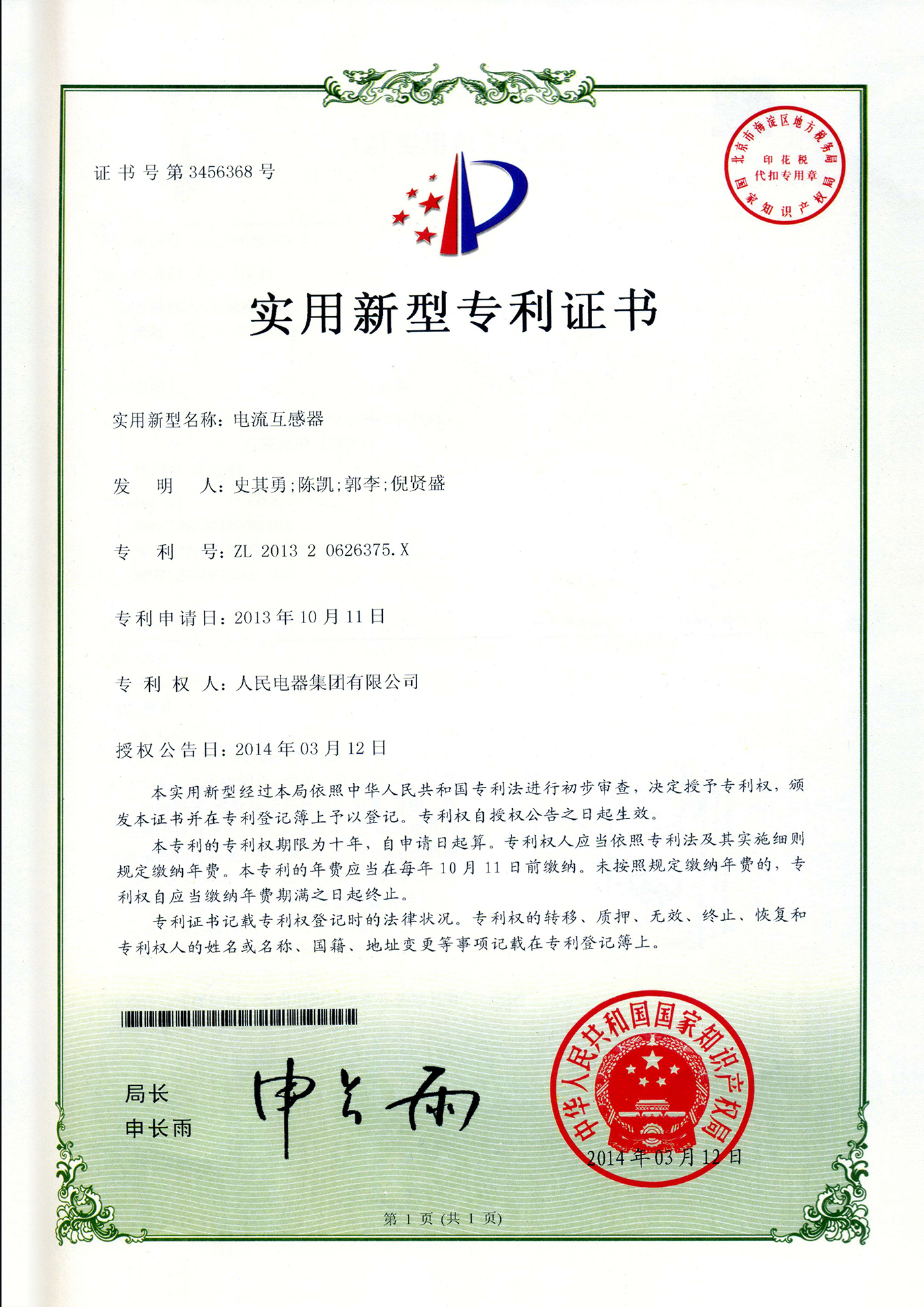 實(shí)用新型專(zhuān)利證書(shū):電流互感器(點(diǎn)擊下載)