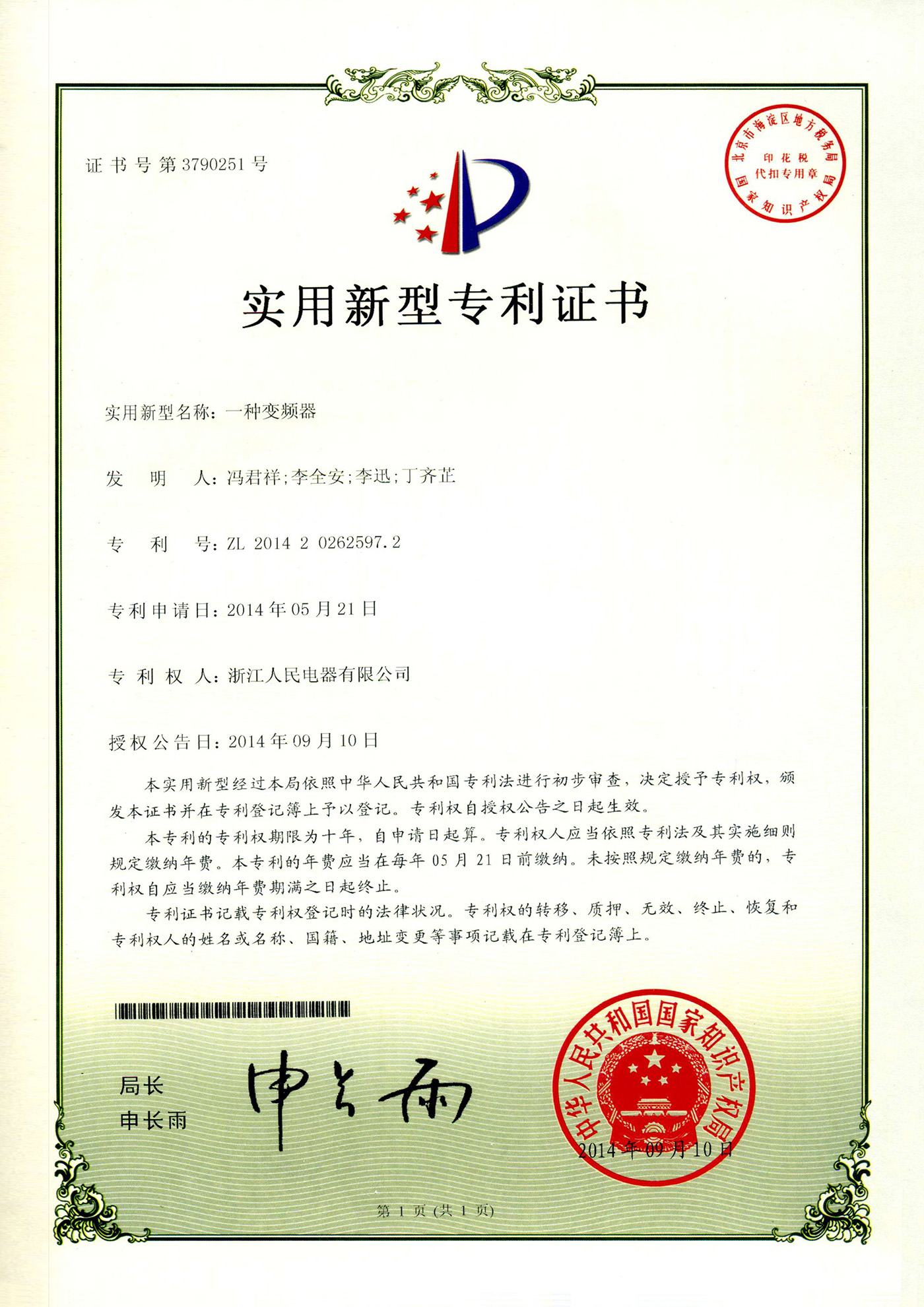 實(shí)用新型專利證書:一種變頻器(點(diǎn)擊下載)