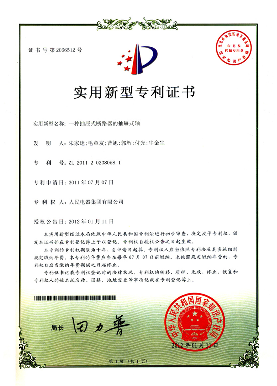 實(shí)用新型專利證書:一種抽屜式斷路器的抽屜式軸(點(diǎn)擊下載)