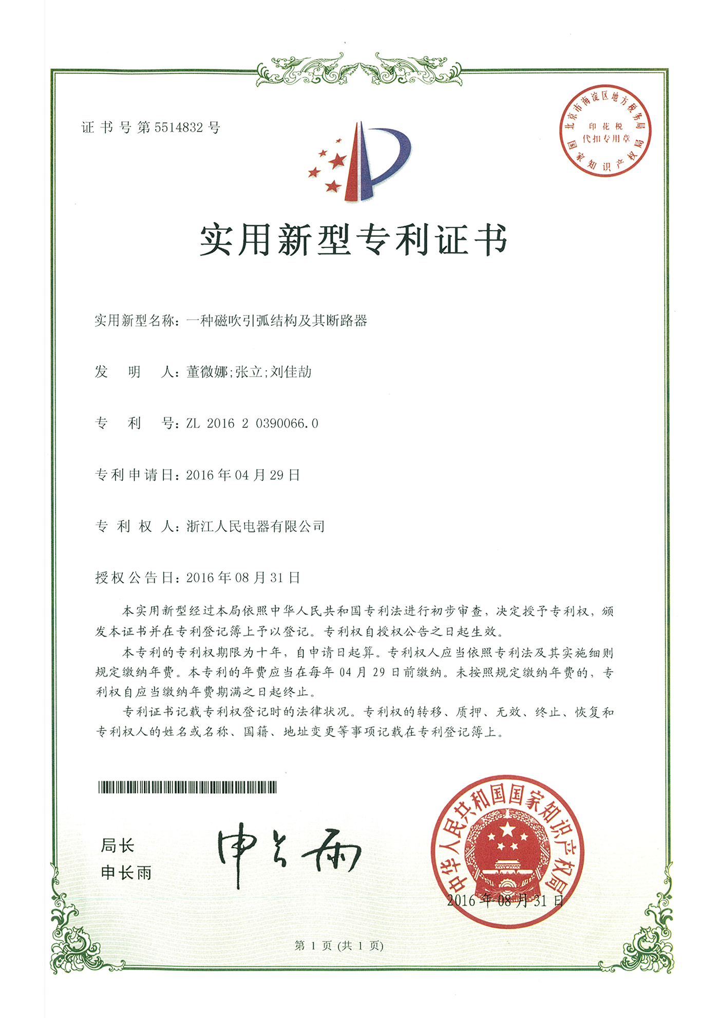 實用新型專利證書:一種磁吹引弧結(jié)構及其斷路器(點擊下載)