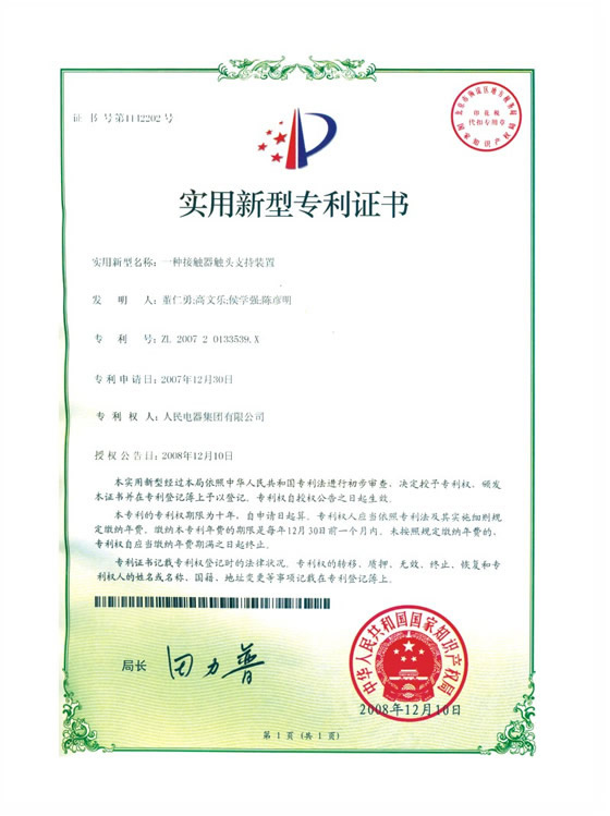 實(shí)用新型專利證書:一種接觸器觸頭支持裝置(點(diǎn)擊下載)