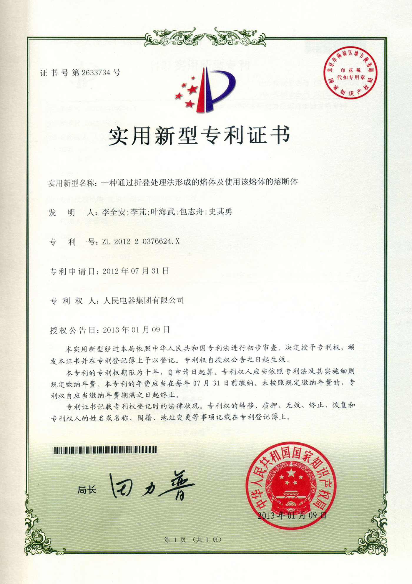 實用新型專利證書:一種通過折疊處理法形成的熔體及使用該熔體的熔斷體(點擊下載)