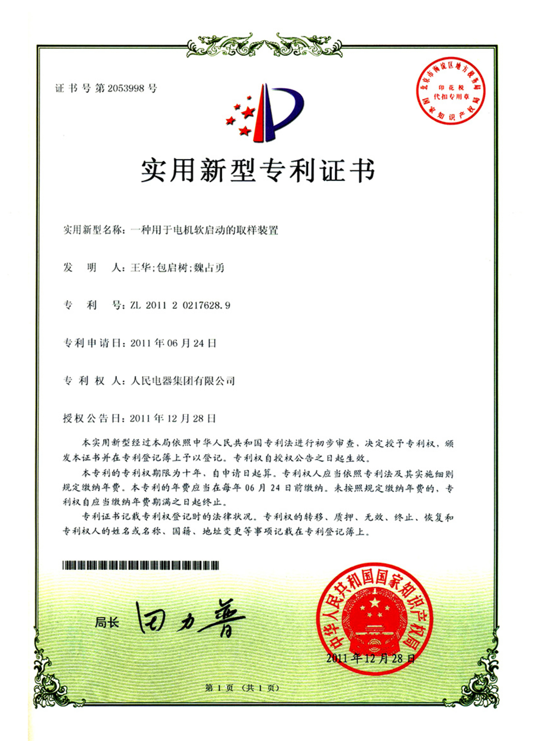 實(shí)用新型專(zhuān)利證書(shū):一種用于電機(jī)軟啟動(dòng)的取樣裝置(點(diǎn)擊下載)
