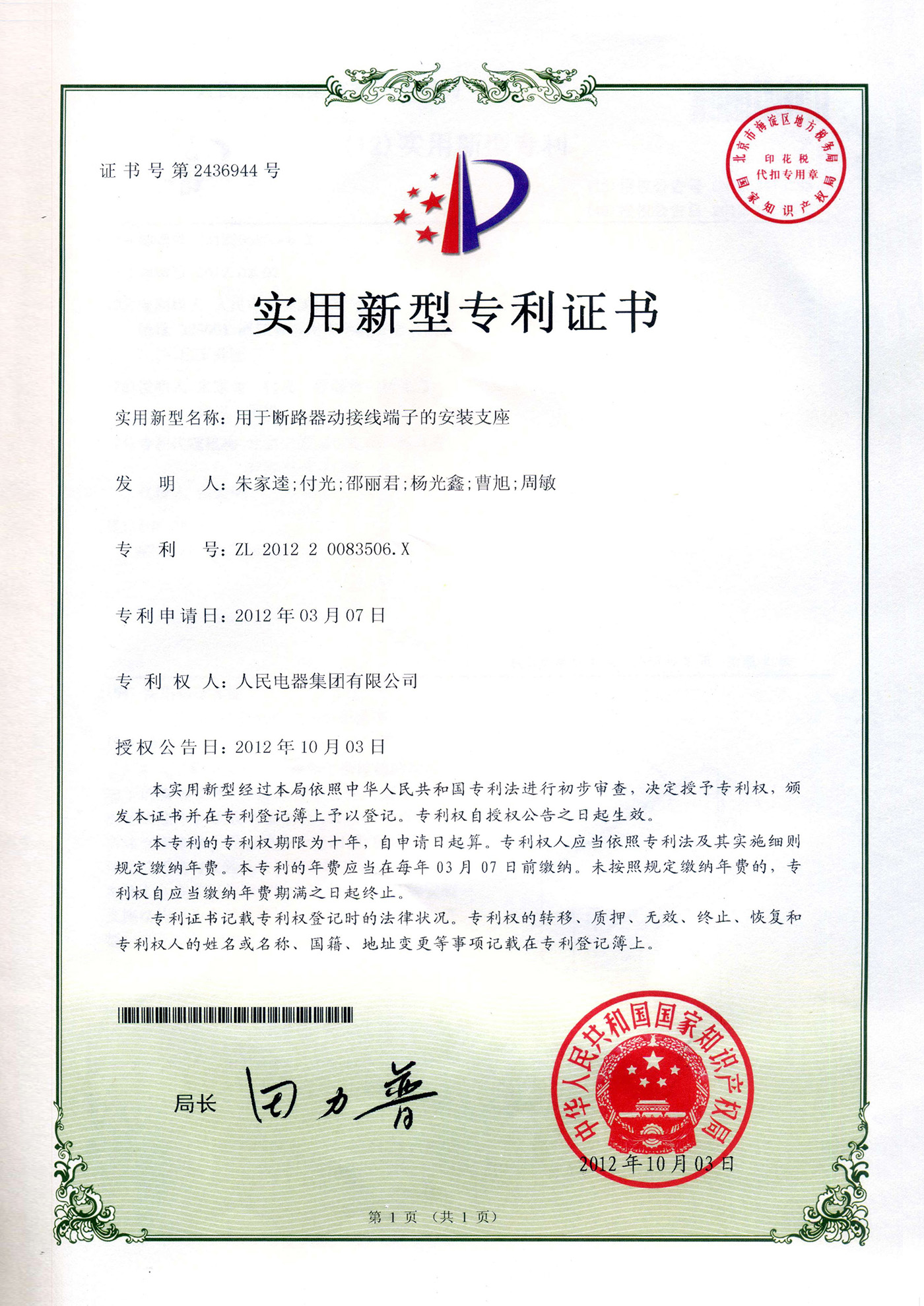 實(shí)用新型專利證書:用于斷路器動(dòng)接線端子的安裝支座(點(diǎn)擊下載)