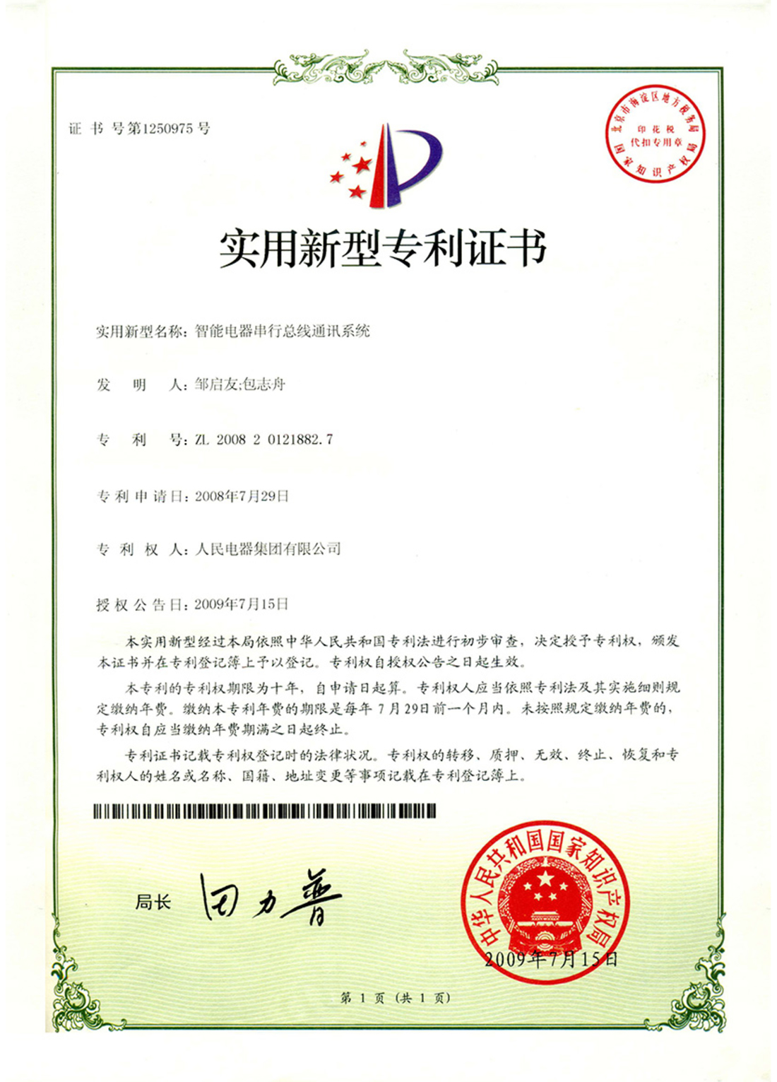 實(shí)用新型專利證書:智能電器串行總線通訊系統(tǒng)(點(diǎn)擊下載)