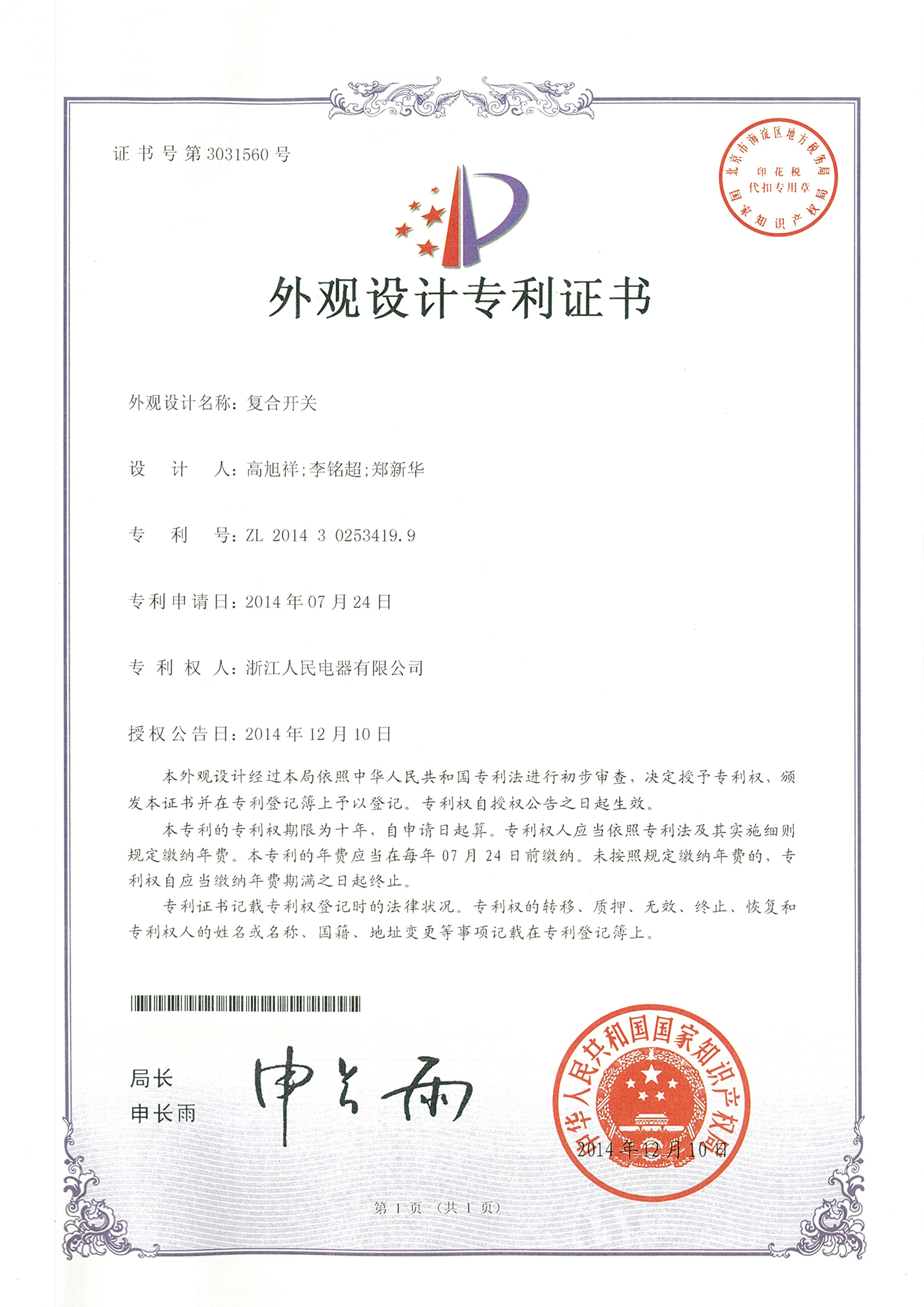 外觀設(shè)計專利證書:復(fù)合開關(guān)(點擊下載)