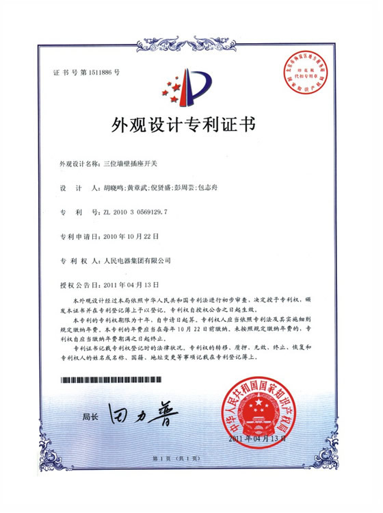 外觀設(shè)計(jì)專利證書:三位墻壁插座開關(guān)(點(diǎn)擊下載)