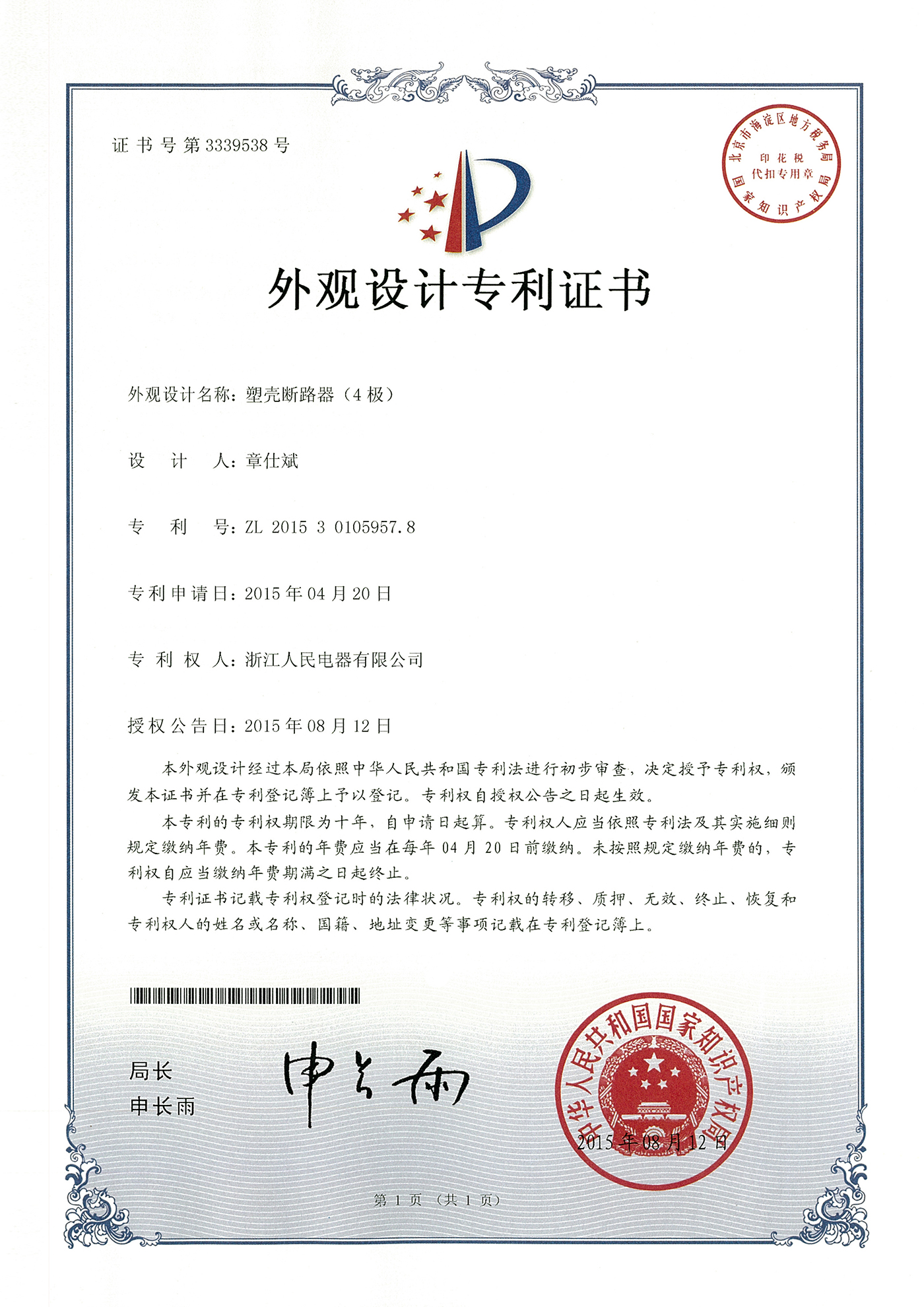 外觀設(shè)計(jì)專利證書:塑殼斷路器(4極)(點(diǎn)擊下載)