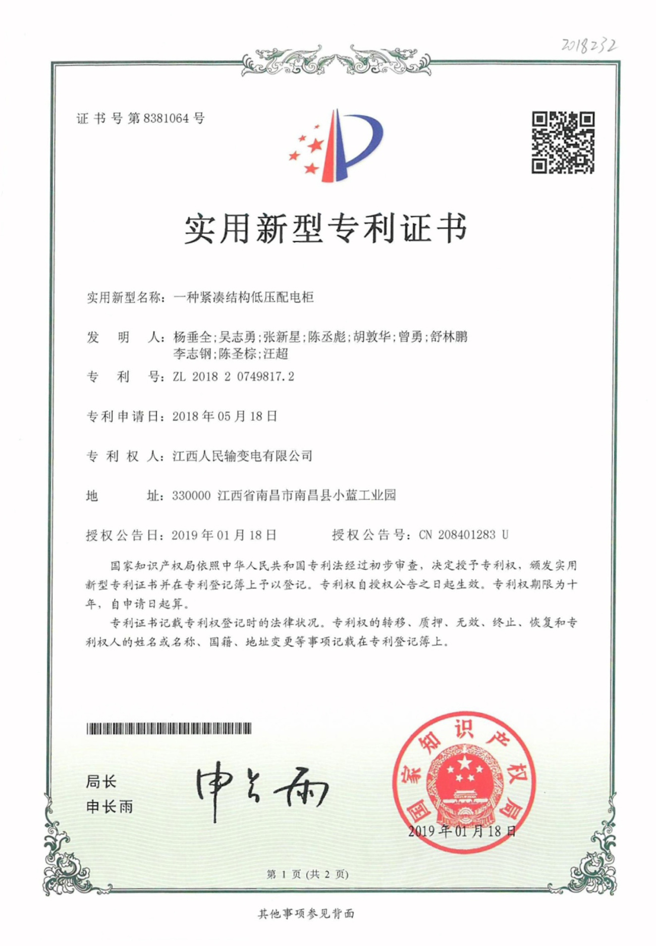 實(shí)用新型專利證書(shū):一種緊湊結(jié)構(gòu)低壓配電柜(點(diǎn)擊下載)
