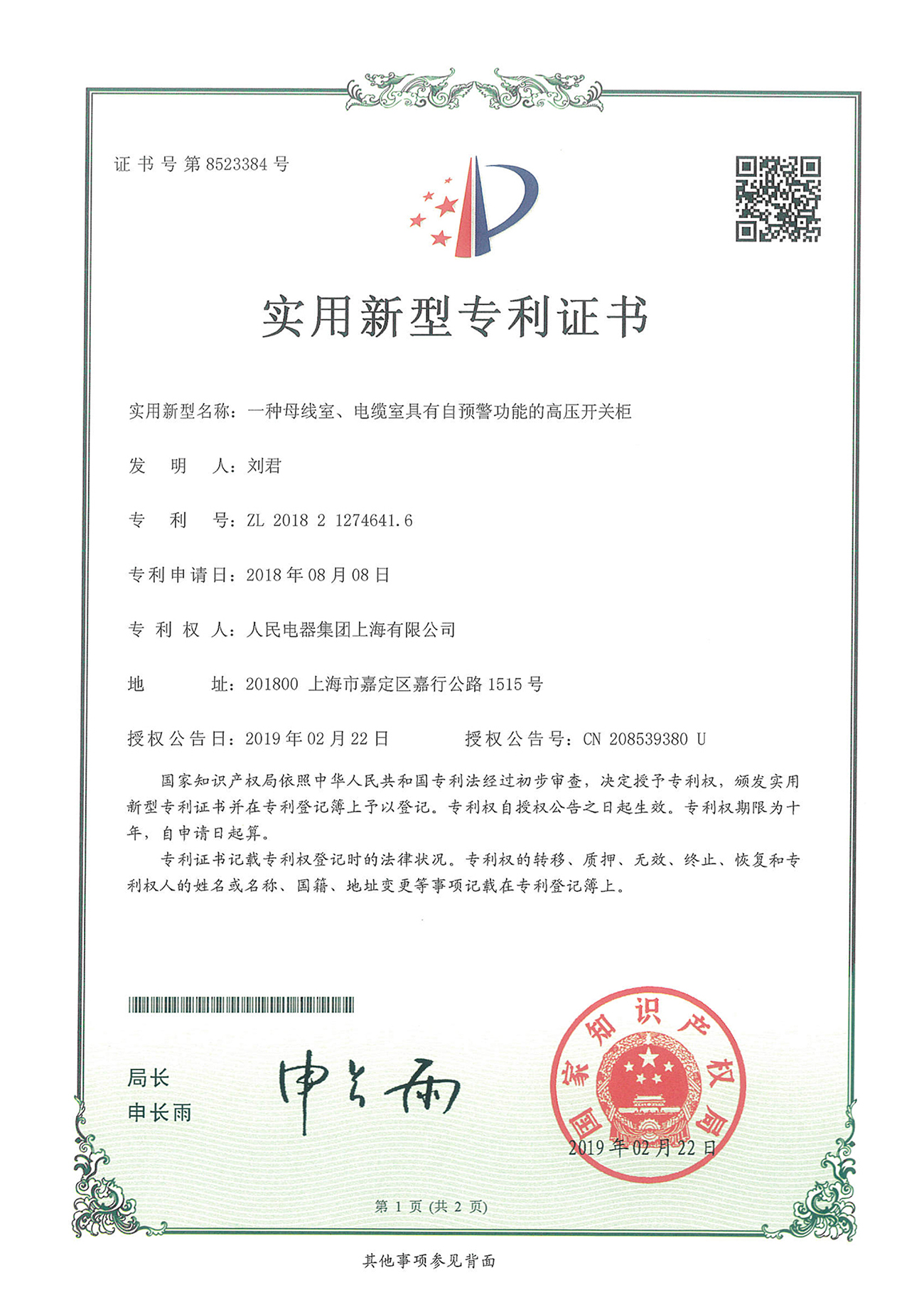 實(shí)用新型專(zhuān)利證書(shū):一種母線(xiàn)室、電纜室具有自預(yù)警功能的高壓開(kāi)關(guān)柜(點(diǎn)擊下載)
