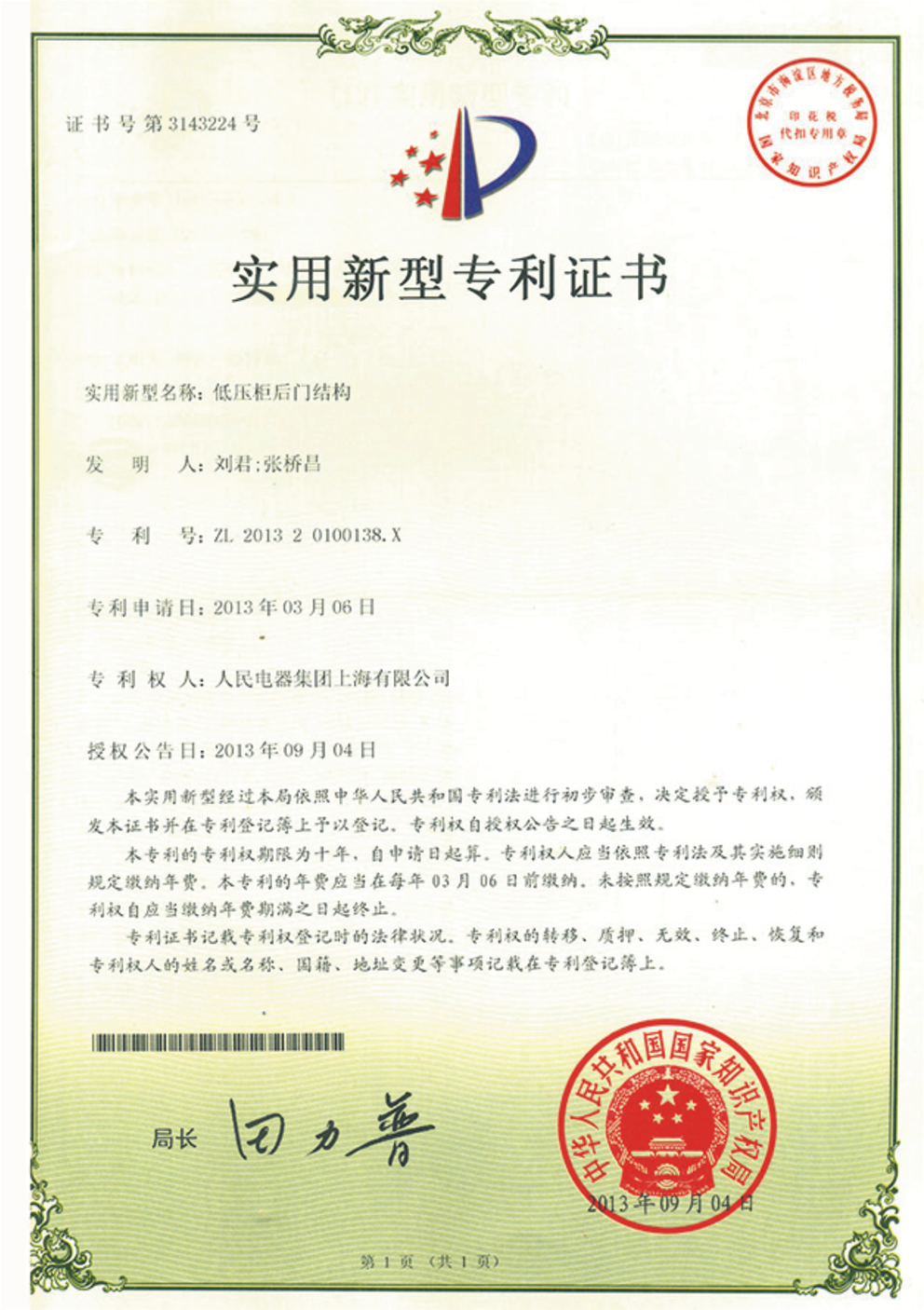 實用新型專利證書:低壓柜后門結(jié)構(gòu)(點擊下載)