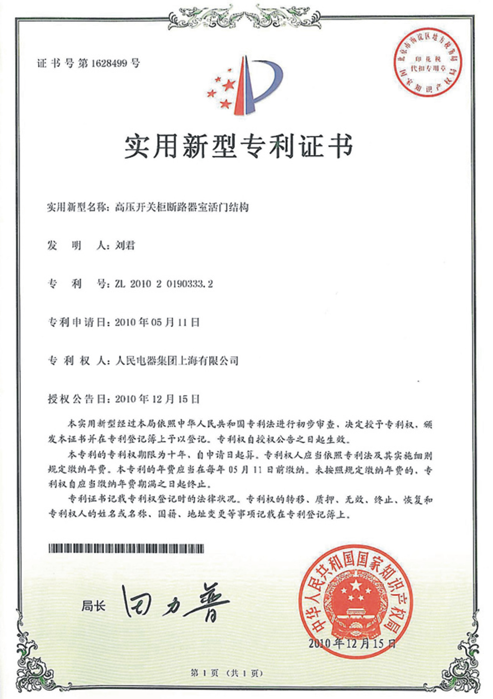 實用新型專利證書:高壓開關(guān)柜斷路器室活門結(jié)構(gòu)(點擊下載)