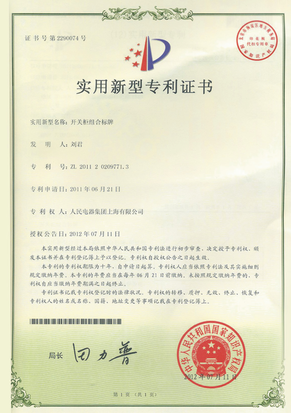 實(shí)用新型專利證書(shū):開(kāi)關(guān)柜組合標(biāo)牌(點(diǎn)擊下載)