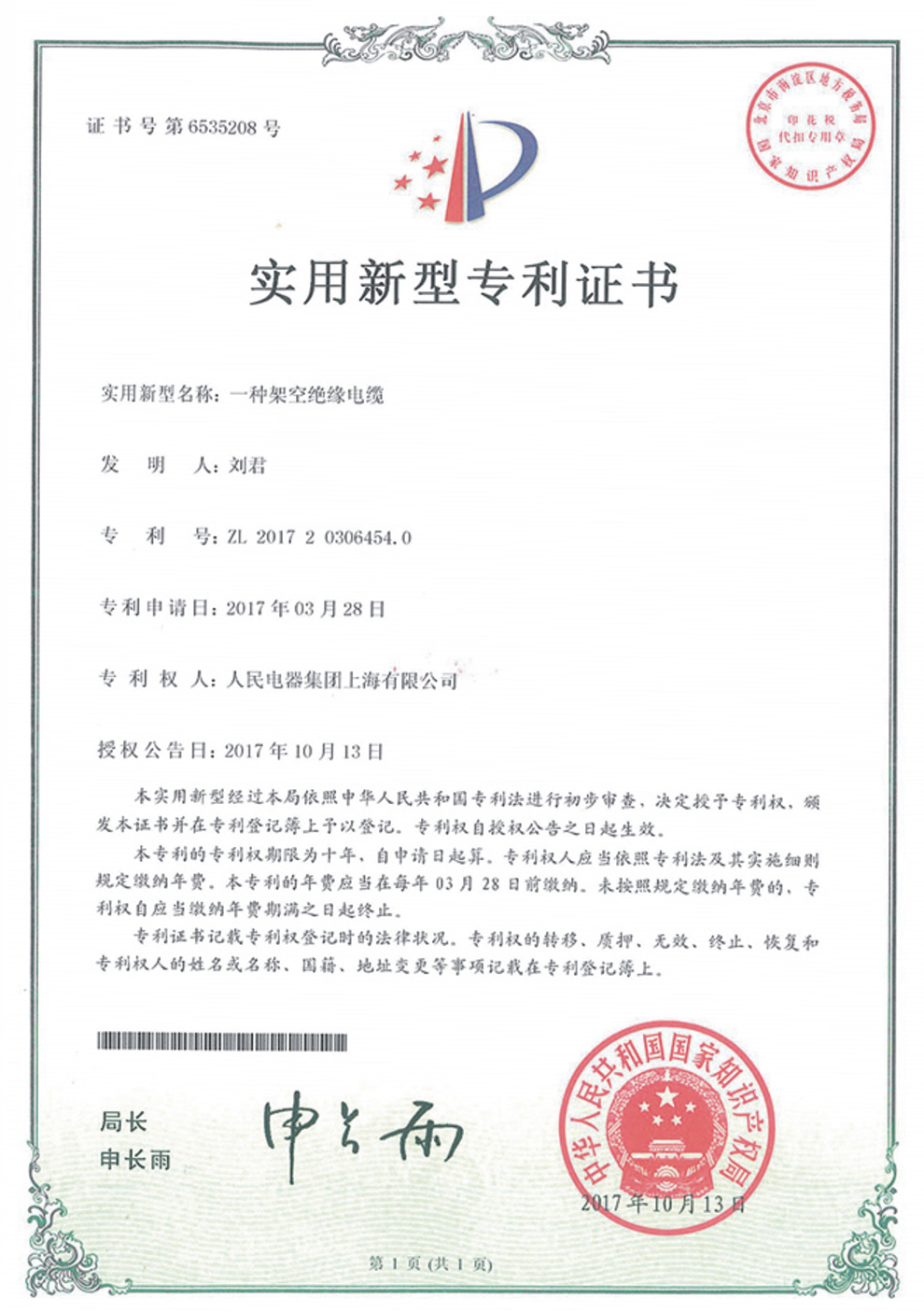 實用新型專利證書:一種架空絕緣電纜(點擊下載)