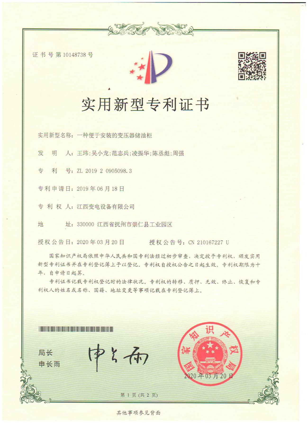 實(shí)用新型專利證書:一種便于安裝的變壓器儲油柜(點(diǎn)擊下載)