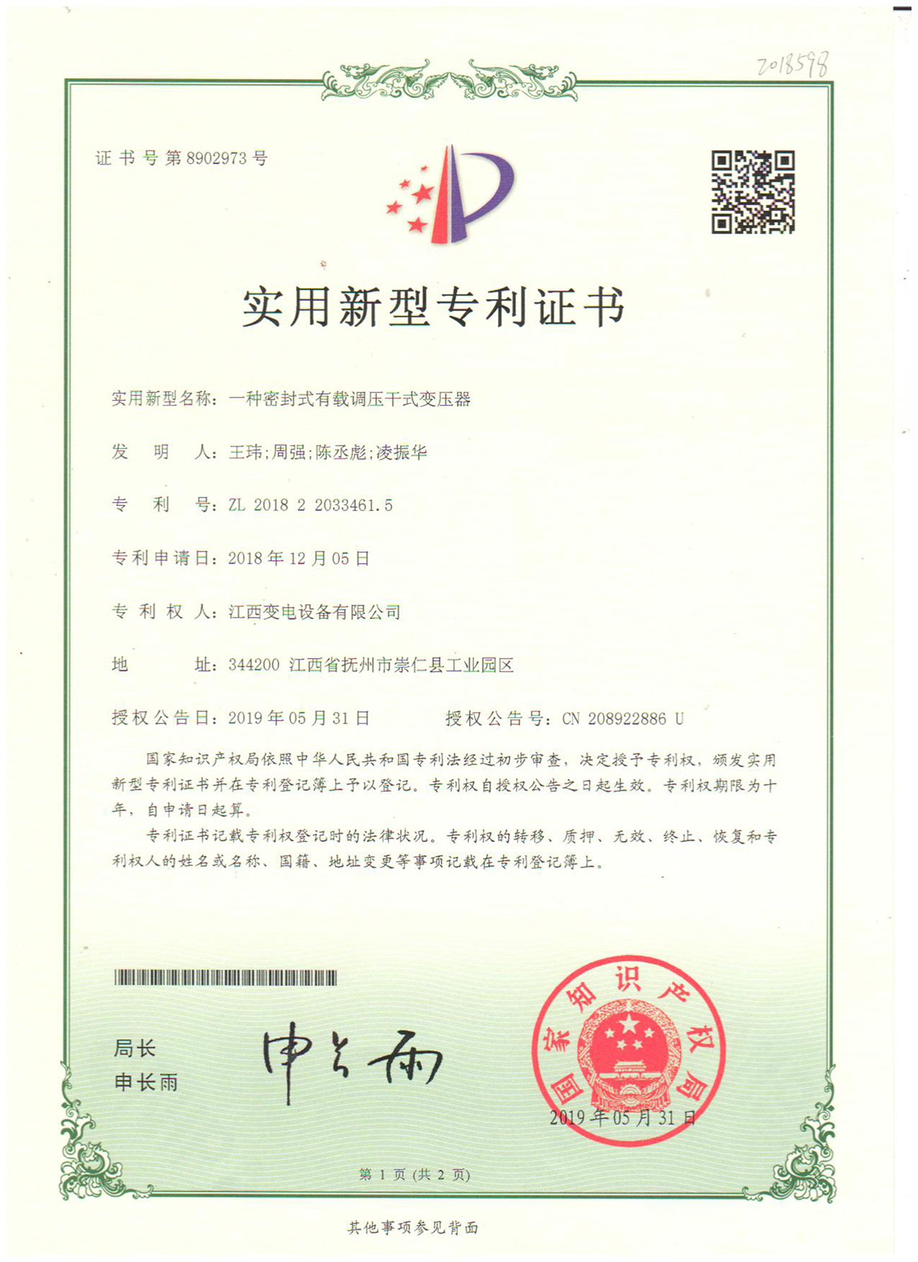 實(shí)用新型專利證書:一種密封式有載調(diào)壓干式變壓器(點(diǎn)擊下載)