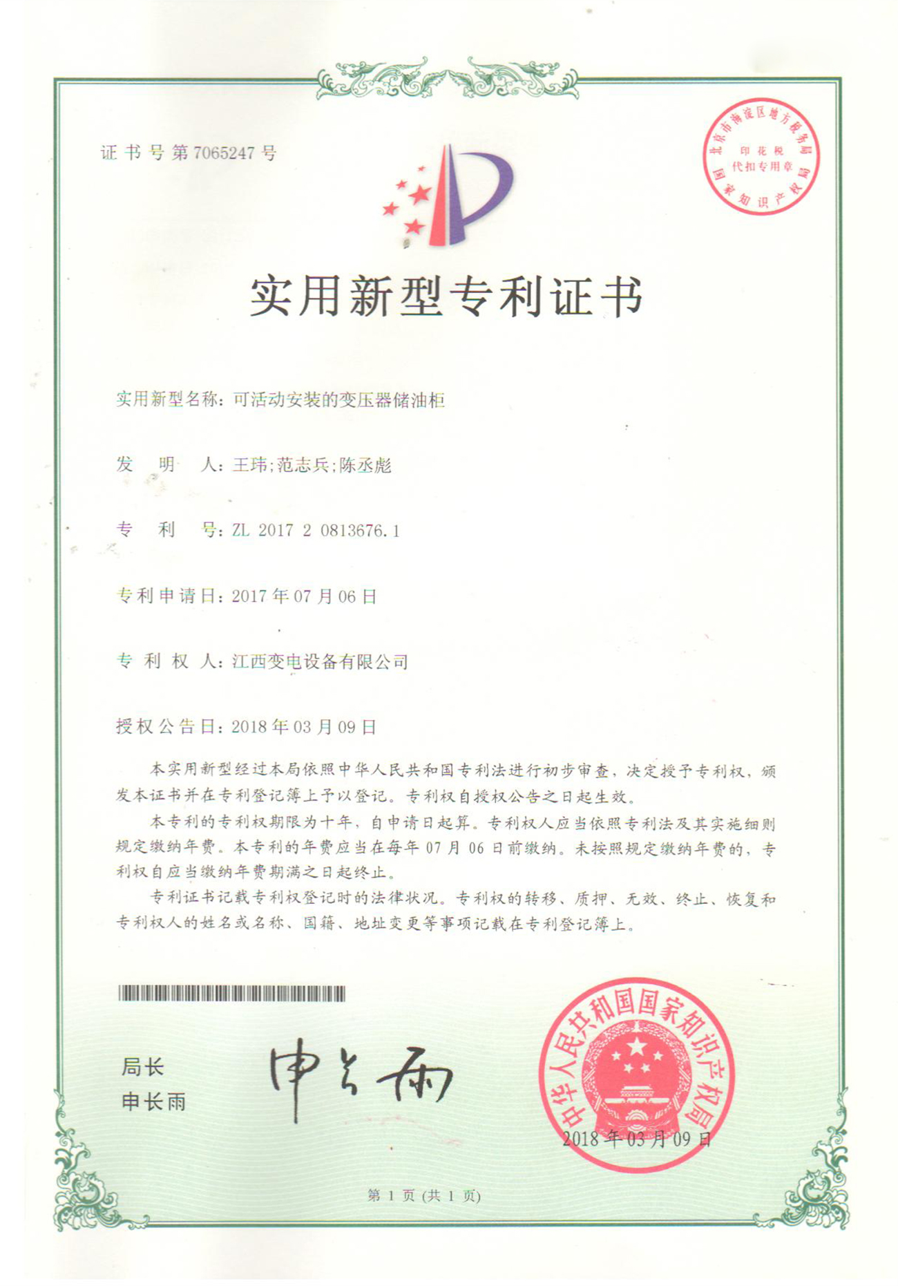 實(shí)用新型專利證書(shū):可活動(dòng)安裝的變壓器儲(chǔ)油柜(點(diǎn)擊下載)