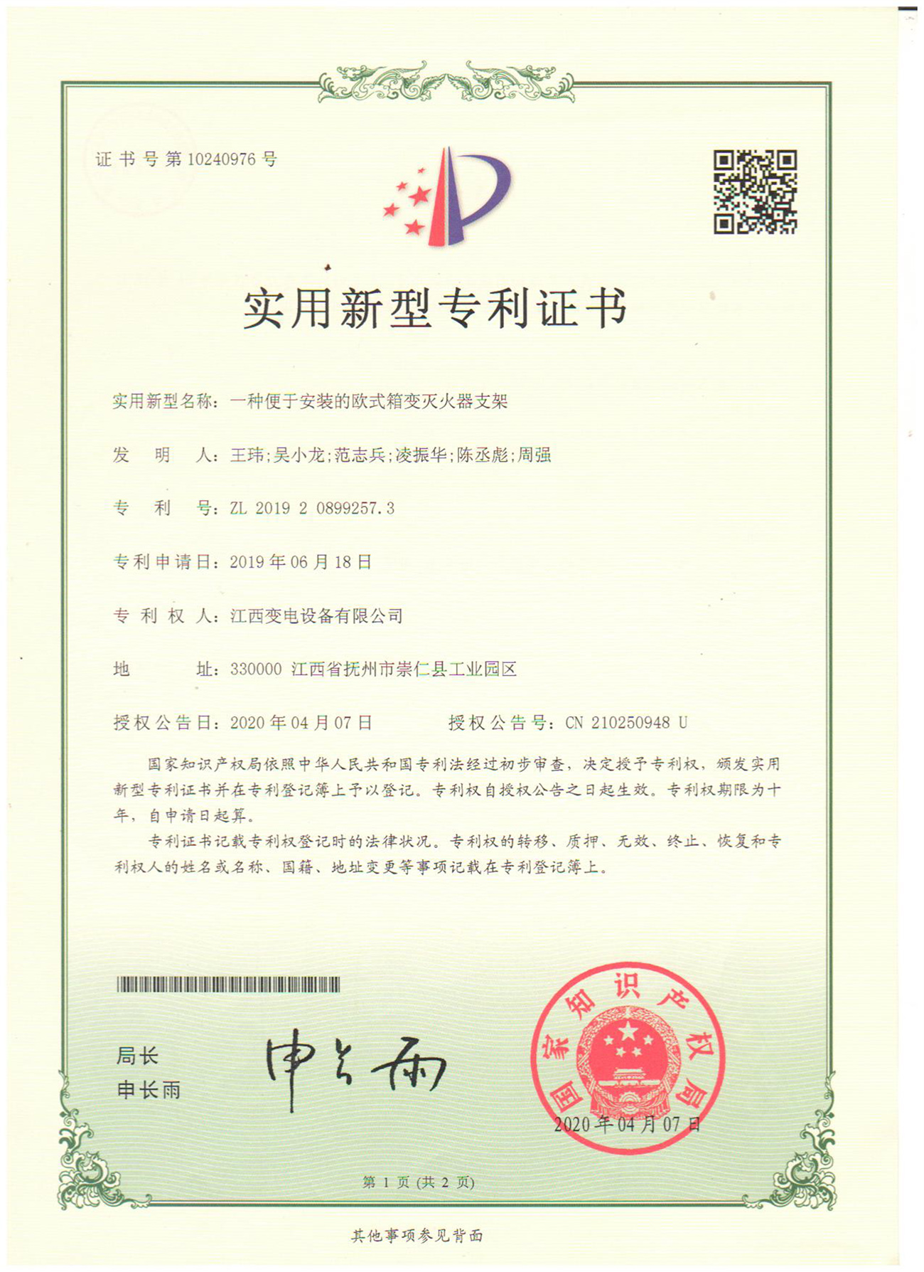 實(shí)用新型專利證書(shū):一種便于安裝的歐式箱變滅火器支架(點(diǎn)擊下載)