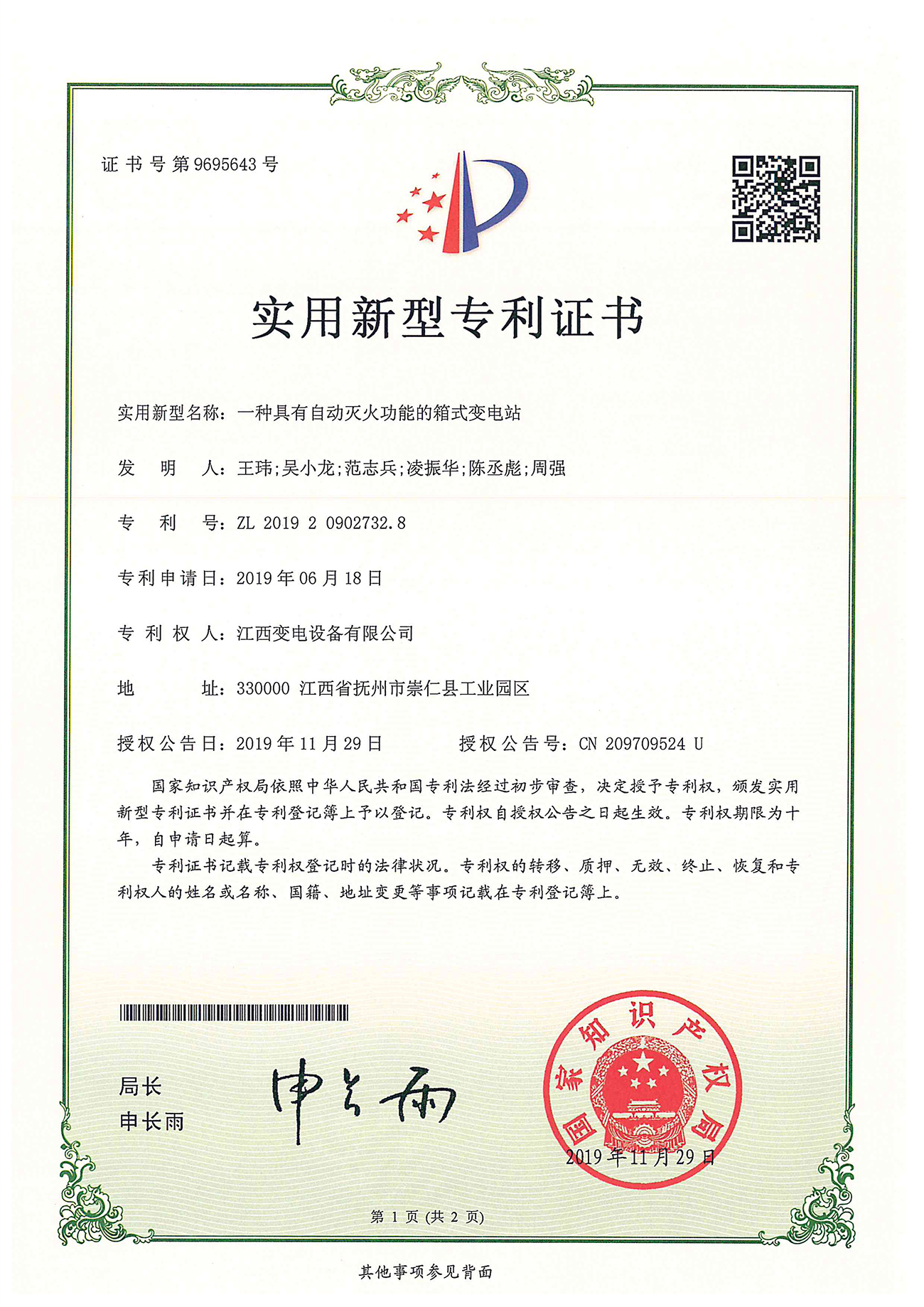 實(shí)用新型專利證書:一種具有自動(dòng)滅火功能的箱式變電站(點(diǎn)擊下載)