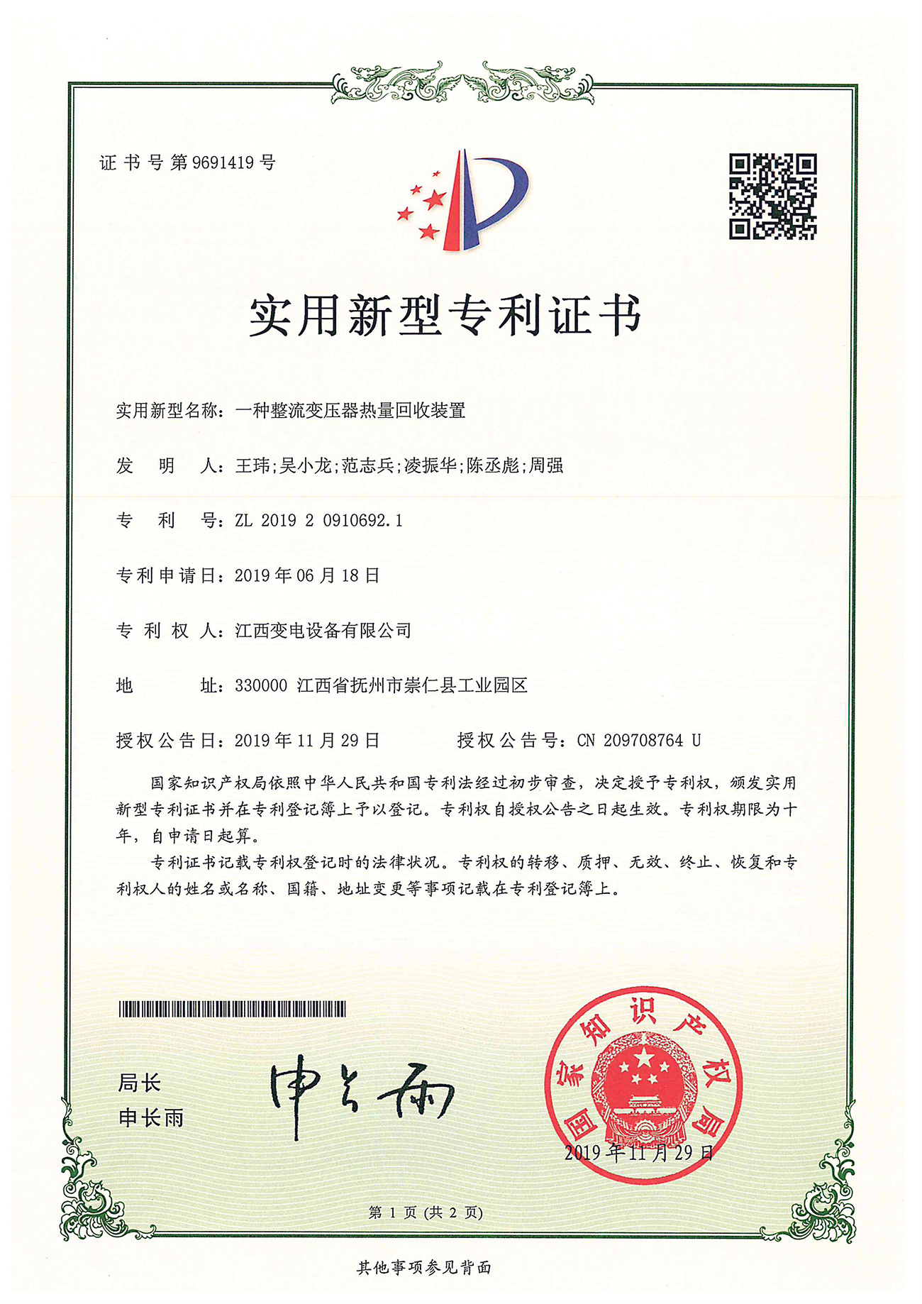實(shí)用新型專利證書(shū):一種整流變壓器熱量回收裝置(點(diǎn)擊下載)