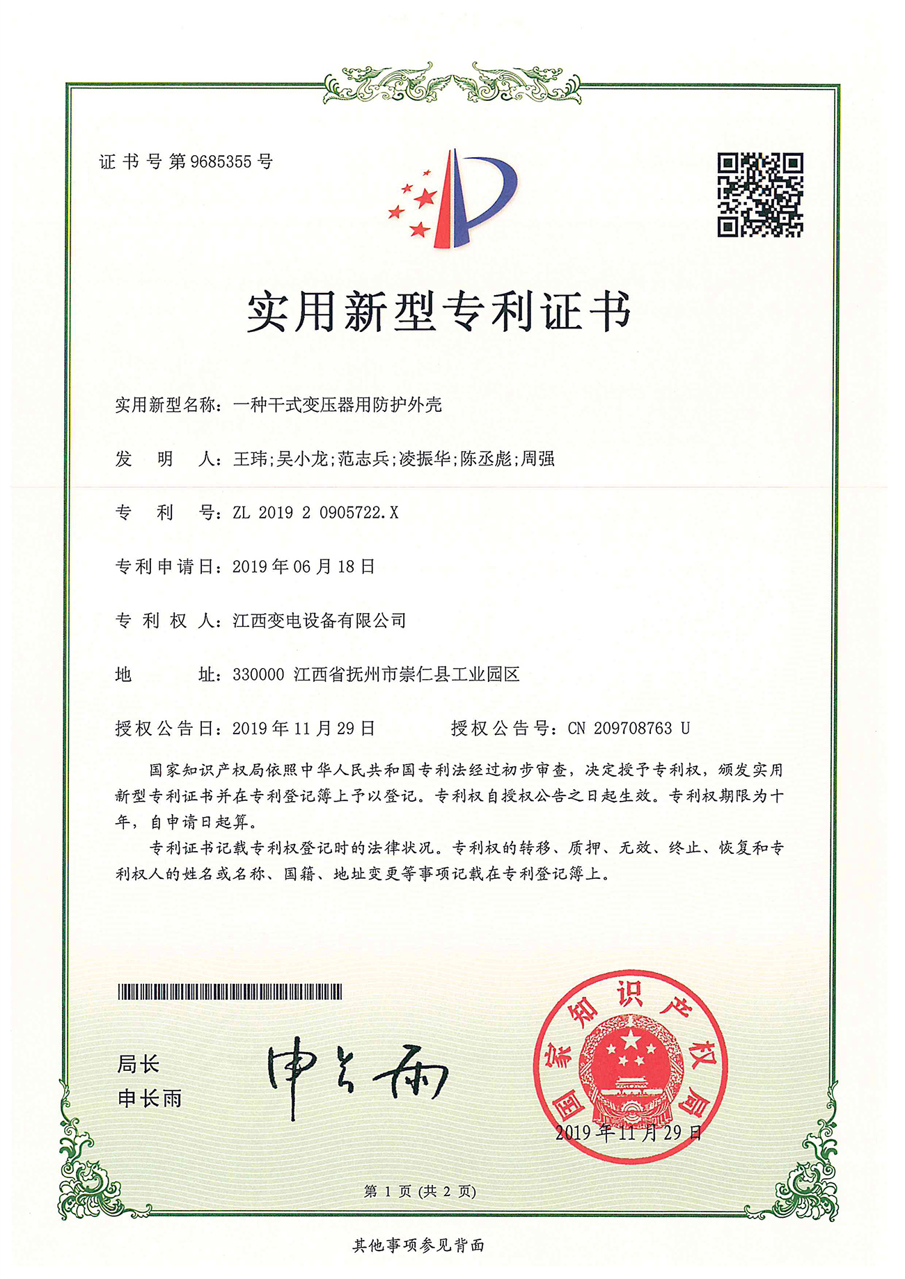 實(shí)用新型專利證書:一種干式變壓器用防護(hù)外殼(點(diǎn)擊下載)