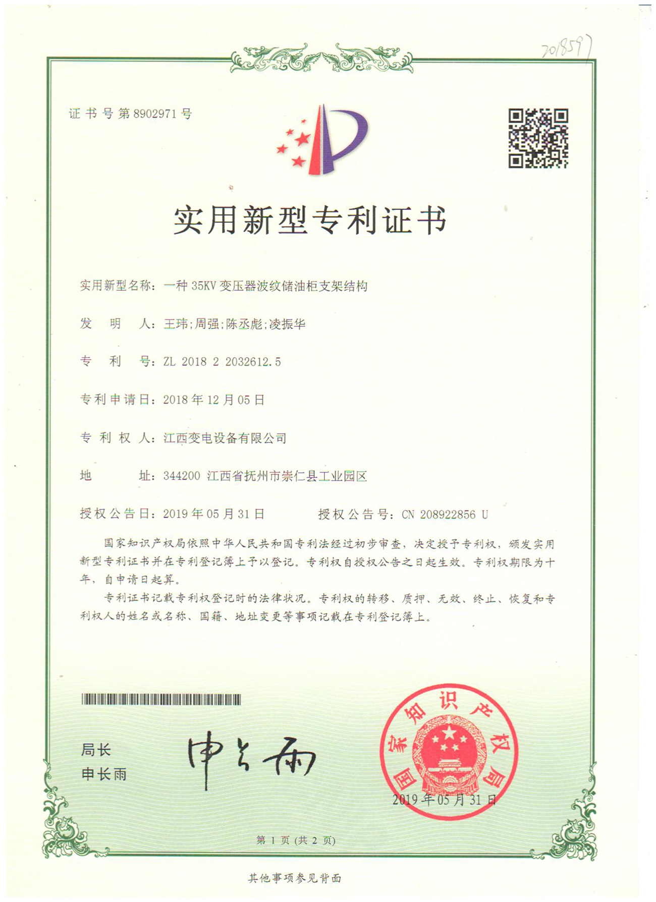 實用新型專利證書:一種35KV變壓器波紋儲油柜支架結(jié)構(gòu)(點擊下載)