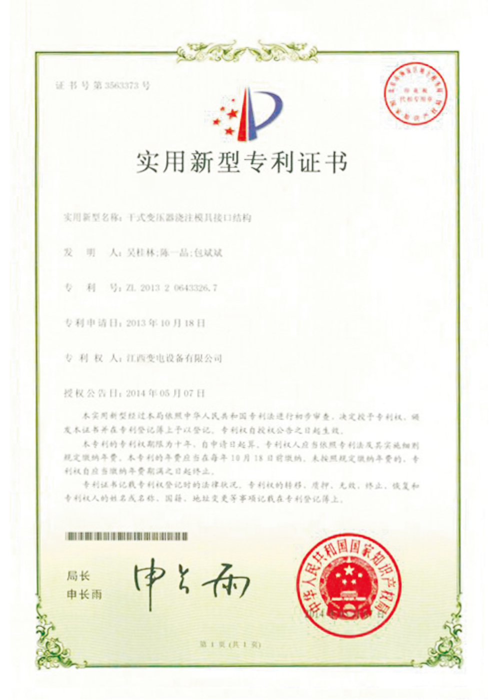 實(shí)用新型專利證書(shū):干式變壓器澆注模具接口結(jié)構(gòu)(點(diǎn)擊下載)