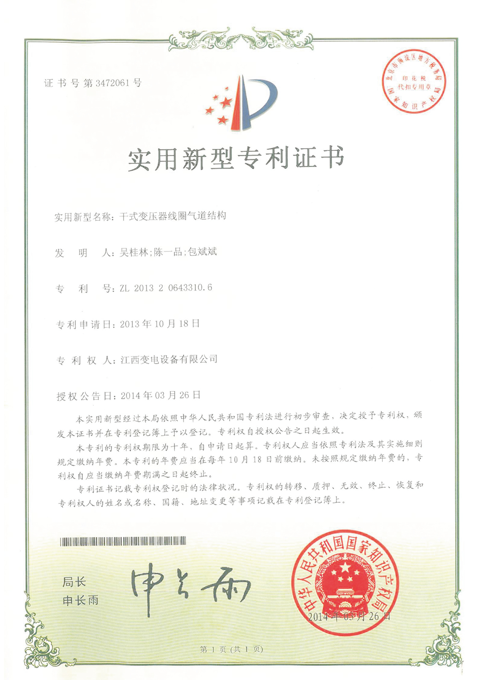 實(shí)用新型專(zhuān)利證書(shū):干式變壓器線(xiàn)圈氣道結(jié)構(gòu)(點(diǎn)擊下載)