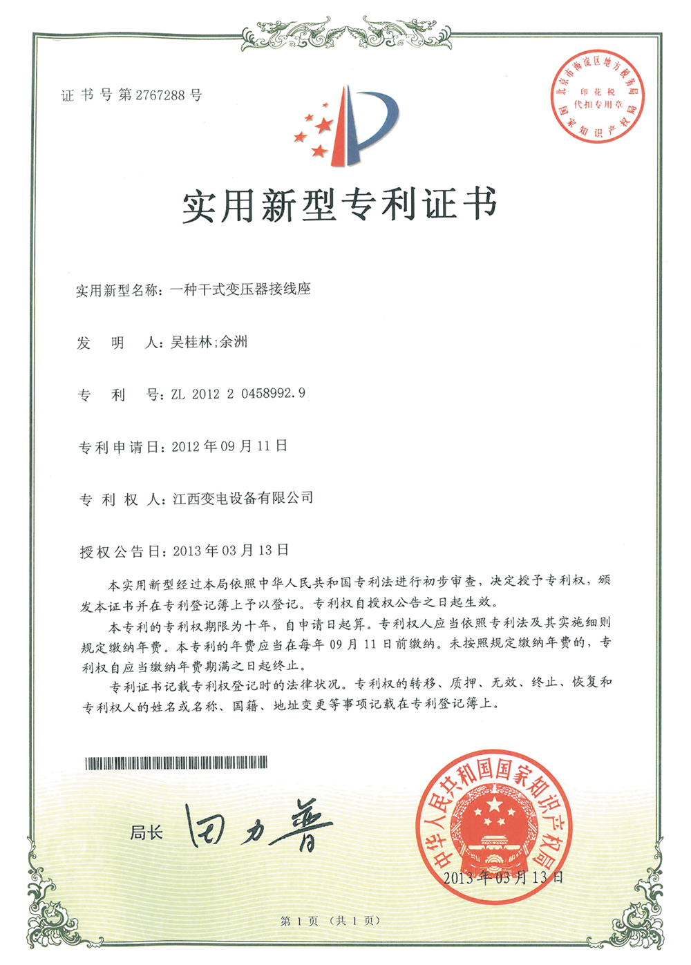 實(shí)用新型專利證書:一種干式變壓器接線座(點(diǎn)擊下載)