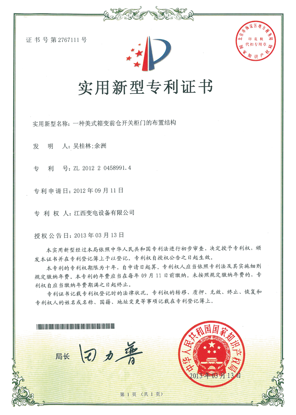 實用新型專利證書:一種美式箱變前倉開關(guān)柜門的布置結(jié)構(gòu)(點擊下載)