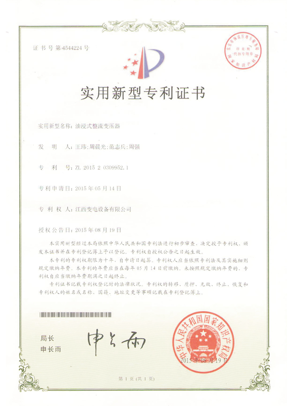 實用新型專利證書:油浸式整流變壓器(點擊下載)
