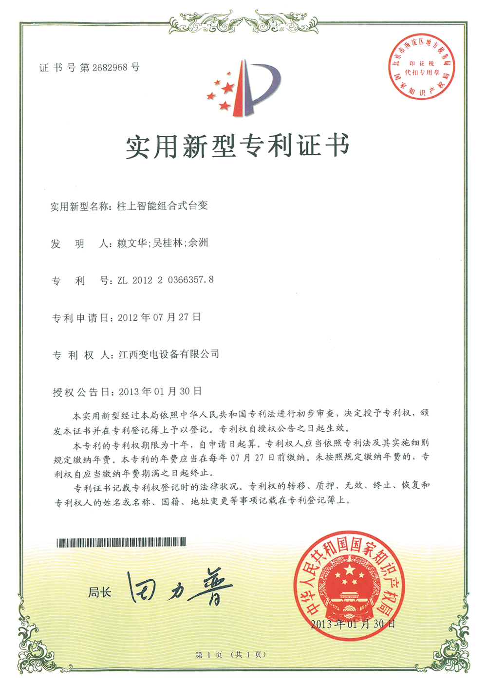 實(shí)用新型專利證書:柱上智能組合式臺(tái)變(點(diǎn)擊下載)