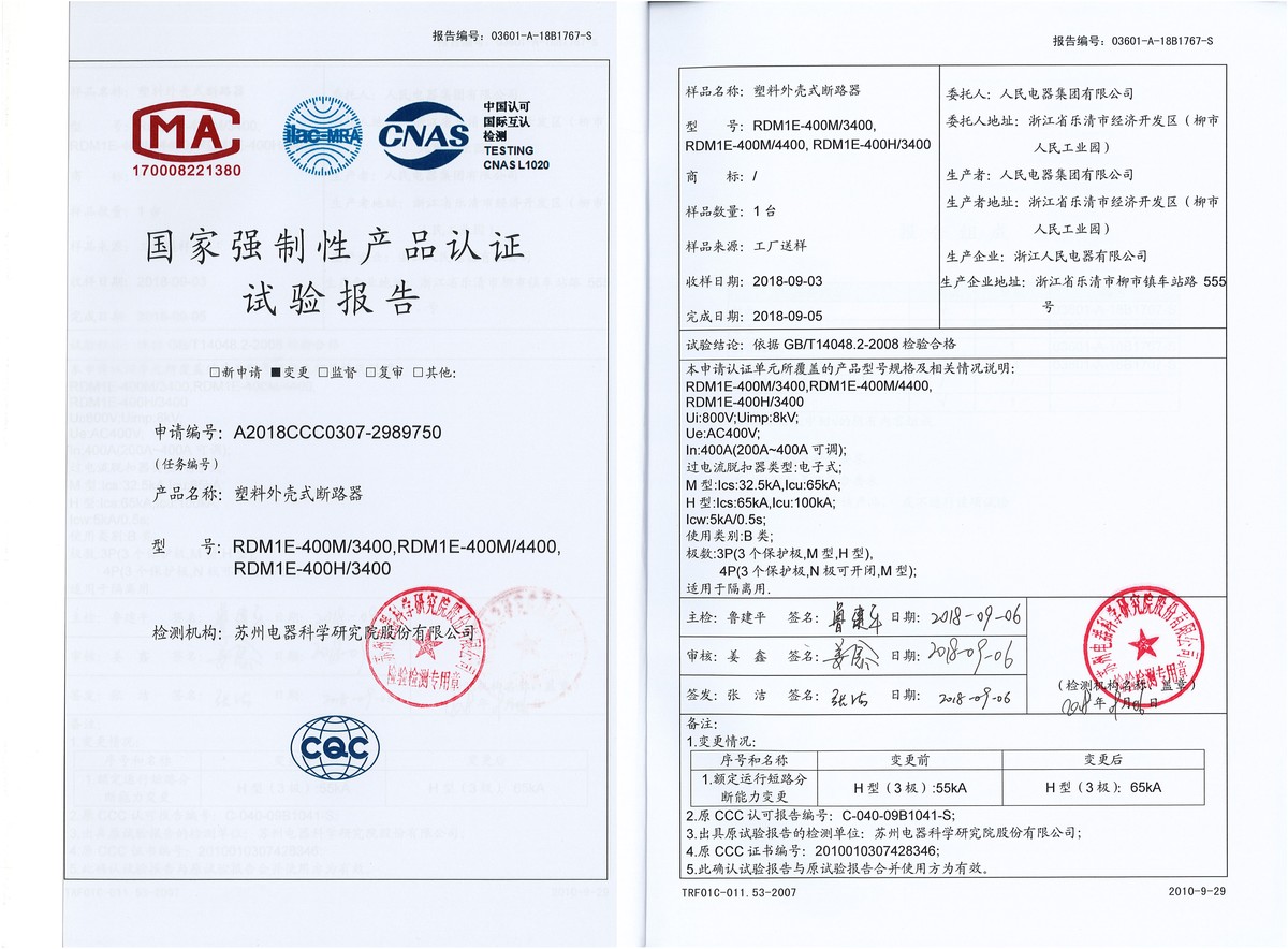CCC試驗報告(201809):RDM1E-400M,RDM1E-400H塑料外殼式斷路器(點擊下載)