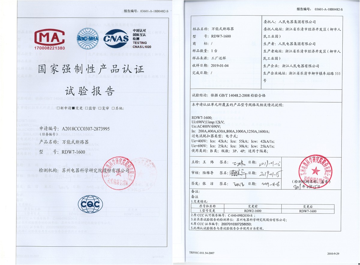 CCC試驗報告(201901):RDW7-1600萬能式斷路器(點擊下載)