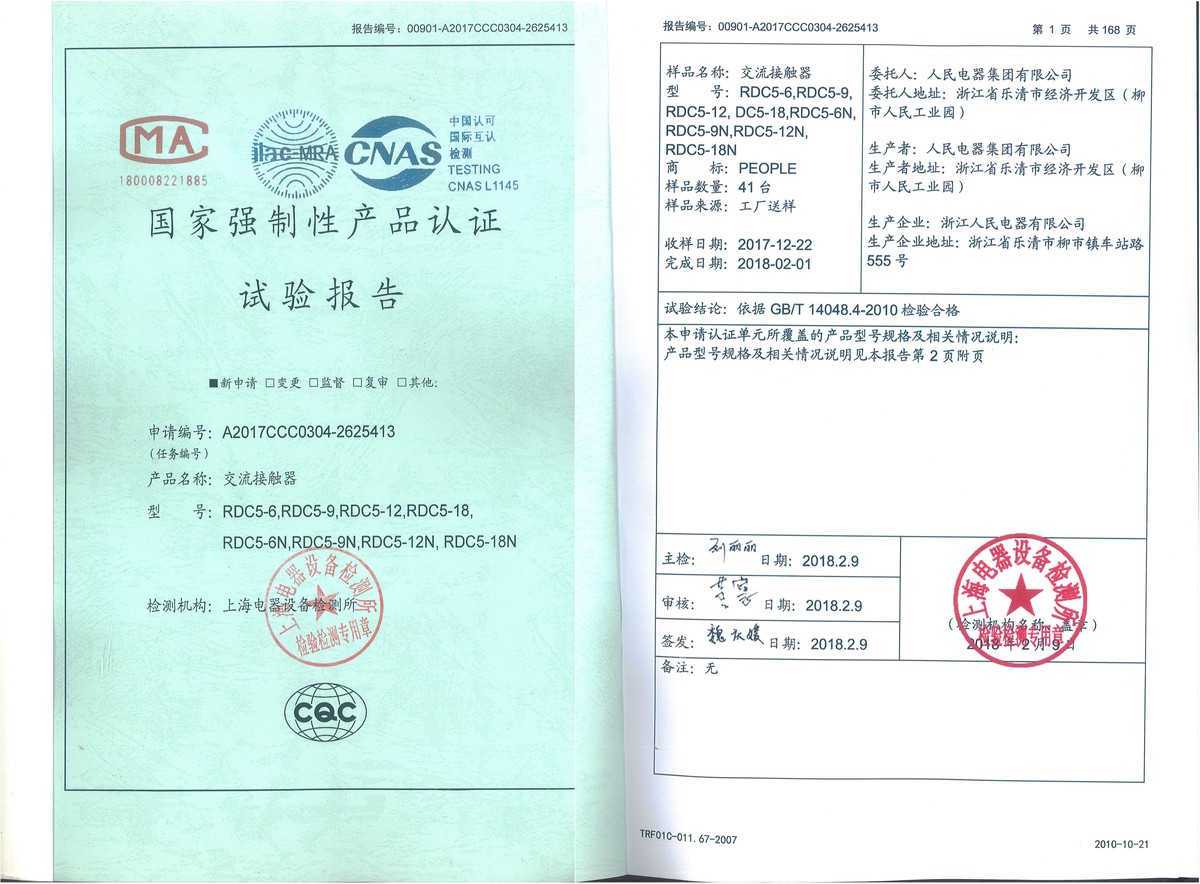 CCC試驗報告(201802):RDC5-6,RDC5-9,RDC5-12,RDC5-18,RDC5-6N,RDC5-9N,RDC5-12N,RDC5-18N交流接觸器(點擊下載)