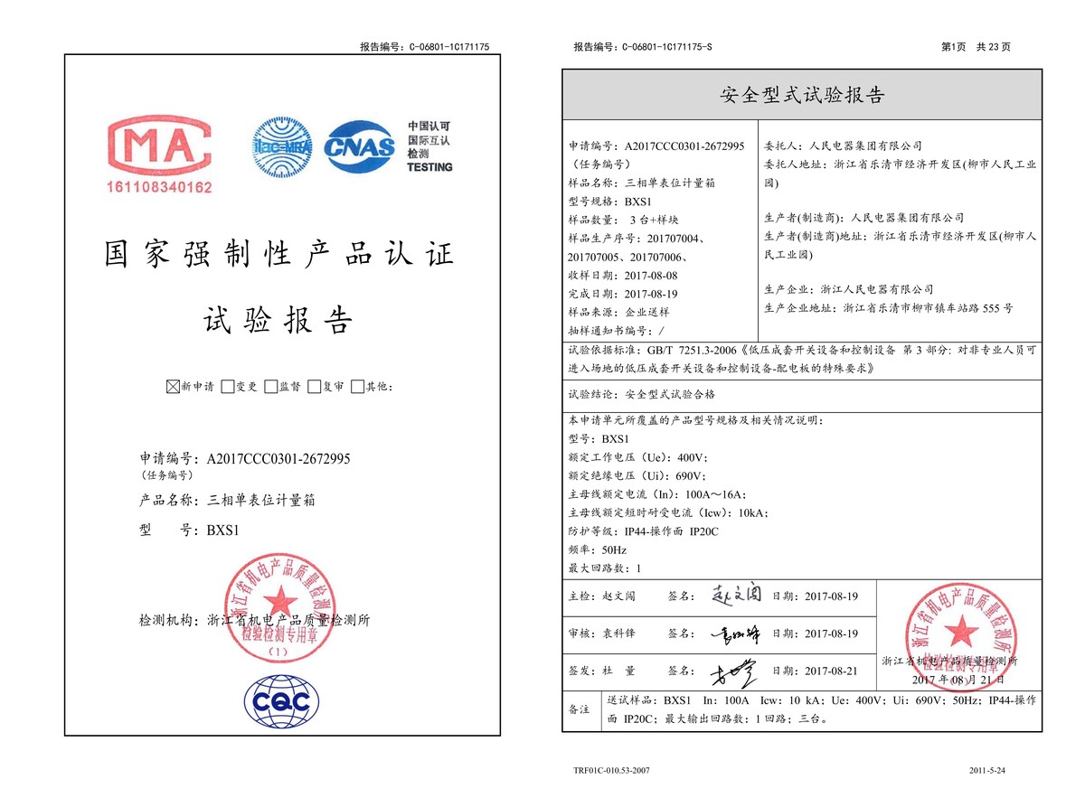 CCC試驗(yàn)報(bào)告(201708):BXS1三相單表位計(jì)量箱(點(diǎn)擊下載)