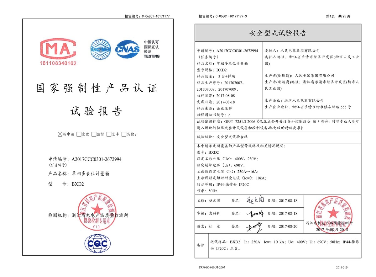 CCC試驗(yàn)報(bào)告(201708):BXD2單相多表位計(jì)量箱(點(diǎn)擊下載)