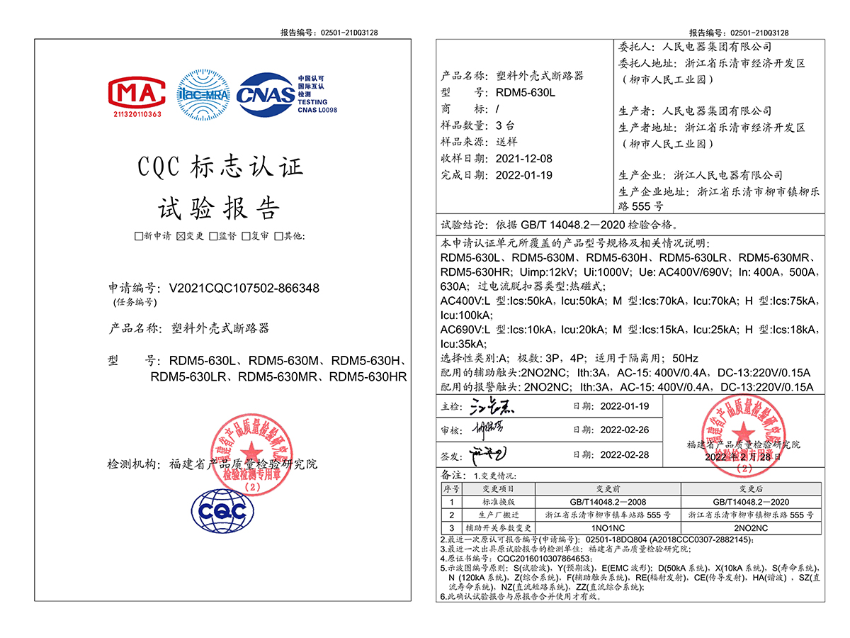 CQC試驗報告(202202):RDM5-630L,RDM5-630M,RDM5-630H,RDM5-630LR,RDM5-630MR,RDM5-630HR塑料外殼式斷路器(點擊下載)