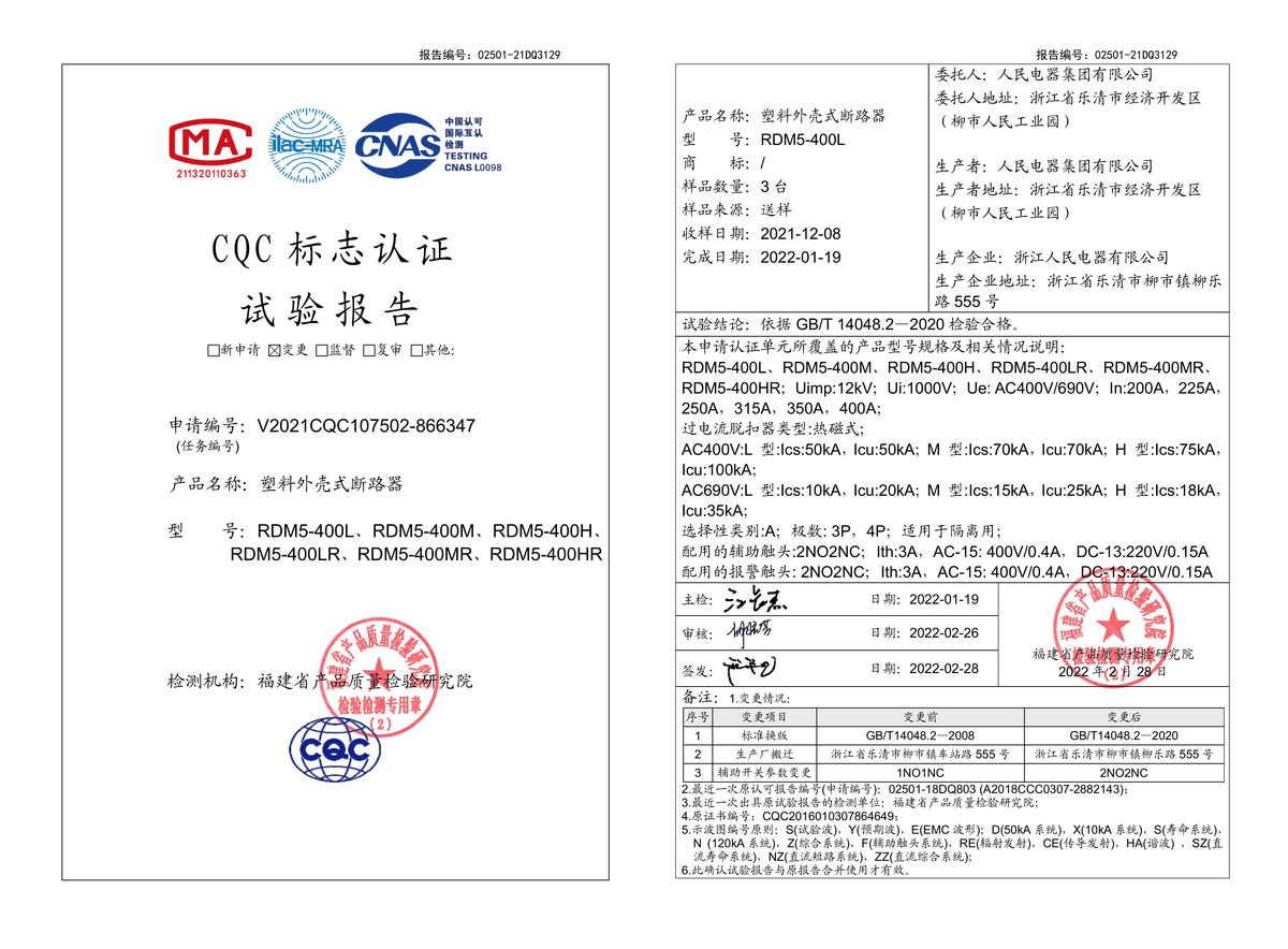 CQC試驗(yàn)報(bào)告(202202):RDM5-400L,RDM5-400M,RDM5-400H,RDM5-400LR,RDM5-400MR,RDM5-400HR塑料外殼式斷路器(點(diǎn)擊下載)