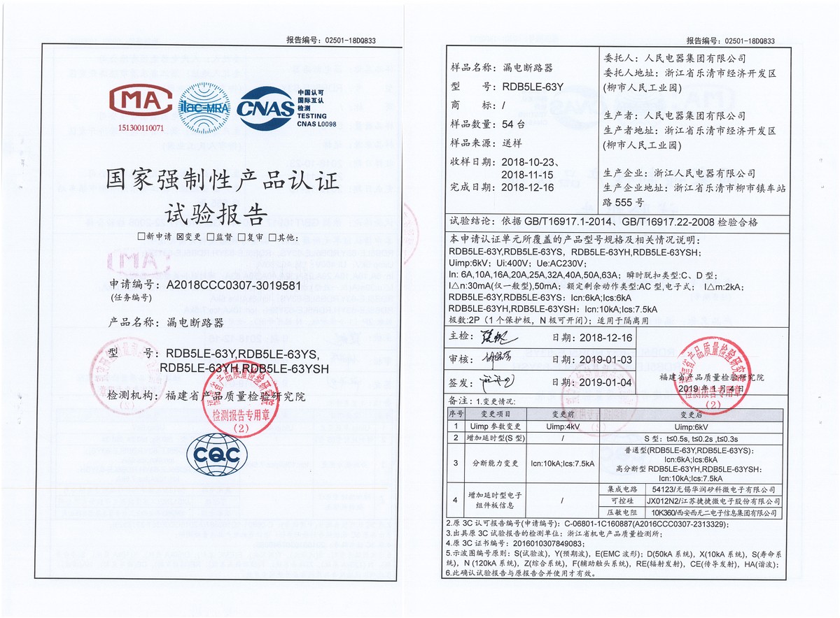 CCC試驗(yàn)報(bào)告(201901):RDB5LE-63Y,RDB5LE-63YS,RDB5LE-63YH,RDB5LE-63YSH剩余電流動(dòng)作斷路器(點(diǎn)擊下載)